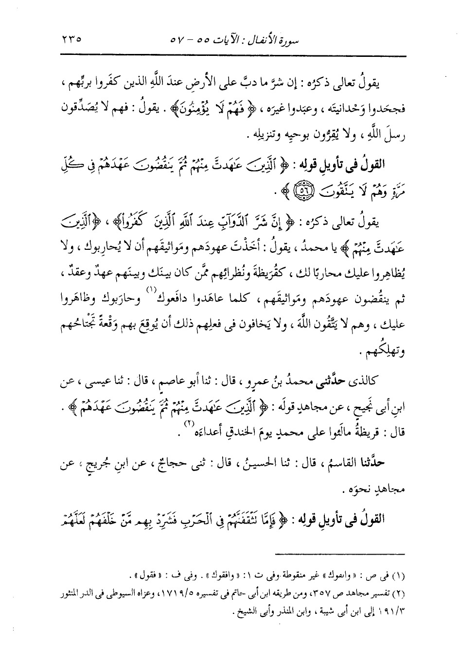 كَالَّذِي: حَدَّثَنِي مُحَمَّدُ بْنُ عَمْرٍو، قَالَ: ثنا أَبُو عَاصِمٍ، قَالَ: ثنا عِيسَى، عَنِ ابْنِ أَبِي نَجِيحٍ، عَنْ مُجَاهِدٍ، قَوْلُهُ: " {§الَّذِينَ عَاهَدْتَ مِنْهُمْ ثُمَّ يَنْقُضُونَ عَهْدَهُمْ} [الأنفال: 56] قَالَ: قُرَيْظَةُ مَالَئُوا عَلَى مُحَمَّدٍ يَوْمَ الْخَنْدَقِ أَعْدَاءَهُ ". حَدَّثَنَا الْقَاسِمُ، قَالَ: ثنا الْحُسَيْنُ، قَالَ: ثني حَجَّاجٌ، عَنِ ابْنِ جُرَيْجٍ، عَنْ مُجَاهِدٍ نَحْوَهُ