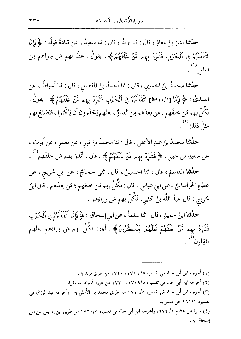 حَدَّثَنَا ابْنُ حُمَيْدٍ، قَالَ: ثنا سَلَمَةُ، عَنِ ابْنِ إِسْحَاقَ: " {§فَإِمَّا تَثْقَفَنَّهُمْ فِي الْحَرْبِ فَشَرِّدْ بِهِمْ مَنْ خَلْفَهُمْ لَعَلَّهُمْ يَذَّكَّرُونَ} [الأنفال: 57] أَيْ نَكِّلْ بِهِمْ مَنْ وَرَاءَهُمْ لَعَلَّهُمْ يَعْقِلُونَ "