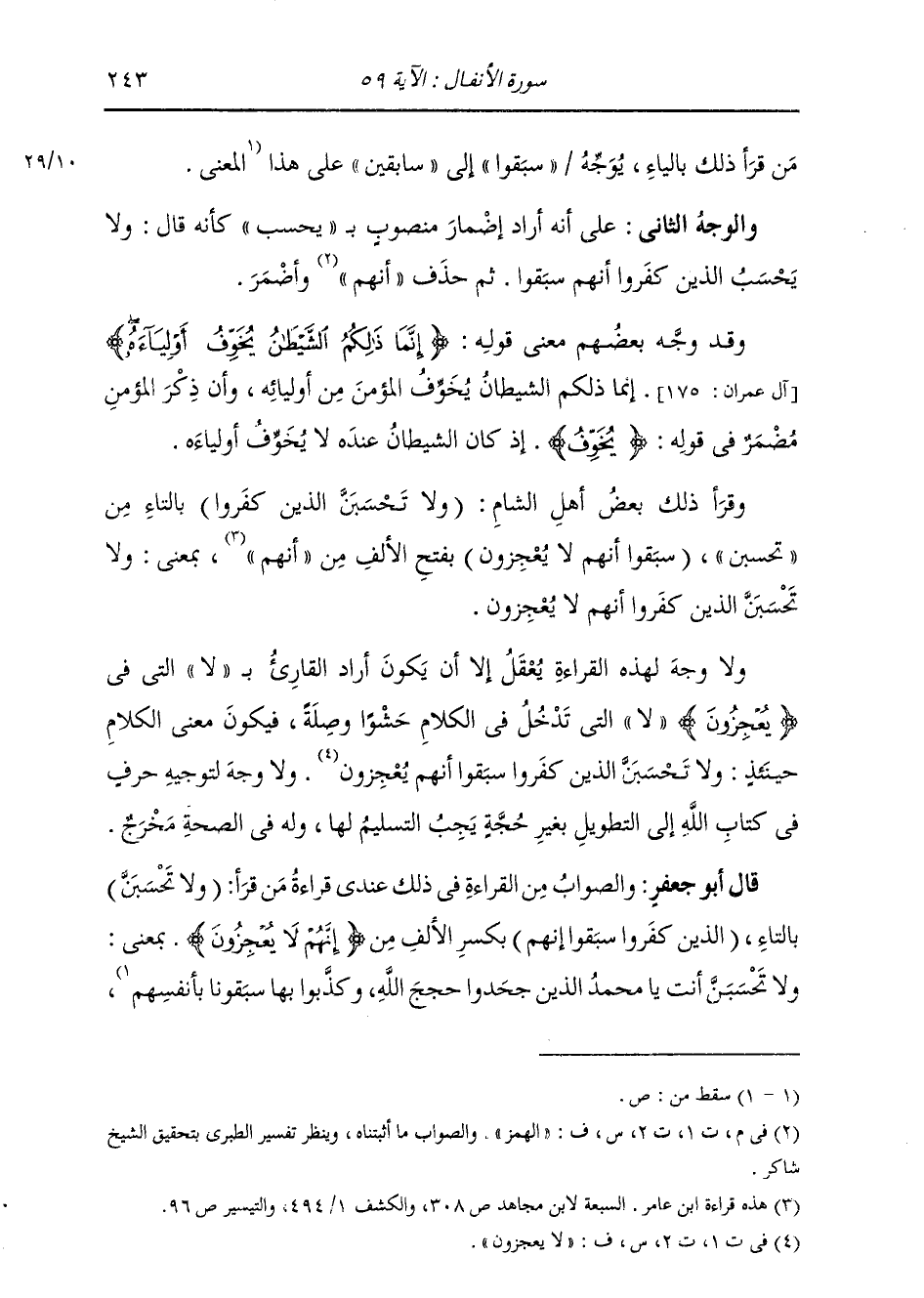 مَنْ قَرَأَ ذَلِكَ بِالْيَاءِ، يُوَجَّهُ «سَبَقُوا» إِلَى «سَابِقِينَ» عَلَى هَذَا الْمَعْنَى. وَالْوَجْهُ الثَّانِي عَلَى أَنَّهُ أَرَادَ إِضْمَارَ مَنْصُوبٍ بِـ «يَحْسِبُ» كَأَنَّهُ قَالَ: وَلَا يَحْسِبُ الَّذِينَ كَفَرُوا أَنَّهُمْ سَبَقُوا، ثُمَّ حَذَفَ الْهَمْزَ وَأَضْمَرَ. وَقَدْ وَجَّهَ بَعْضُهُمْ مَعْنَى قَوْلِهِ: {إِنَّمَا ذَلِكُمُ الشَّيْطَانُ يُخَوِّفُ أَوْلِيَاءَهُ} [آل عمران: 175] إِنَّمَا ذَلِكُمُ الشَّيْطَانُ يُخَوِّفُ الْمُؤْمِنَ مِنْ أَوْلِيَائِهِ، وَأَنَّ ذِكْرَ الْمُؤْمِنِ مُضْمَرٌ فِي قَوْلِهِ: «يُخَوِّفُ» إِذْ كَانَ الشَّيْطَانُ عِنْدَهُ لَا يُخَوِّفُ أَوْلِيَاءَهُ. وَقَرَأَ ذَلِكَ بَعْضُ أَهْلِ الشَّامِ: وَلَا تَحْسَبَنَّ الَّذِينَ كَفَرُوا بِالتَّاءِ مِنْ تَحْسَبَنَّ سَبَقُوا أَنَّهُمْ لَا يُعْجِزُونَ بِفَتْحِ الْأَلْفِ مِنْ أَنَّهُمْ بِمَعْنَى: وَلَا تَحْسَبَنَّ الَّذِينَ كَفَرُوا أَنَّهُمْ لَا يُعْجِزُونَ. وَلَا وَجْهَ لِهَذِهِ الْقِرَاءَةِ يُعْقَلُ إِلَّا أَنْ يَكُونَ أَرَادَ الْقَارِئُ بِـ لَا الَّتِي فِي يُعْجِزُونَ لَا الَّتِي تَدْخُلُ فِي الْكَلَامِ حَشْوًا وَصِلَةً. فَيَكُونُ مَعْنَى الْكَلَامِ حِينَئِذٍ: وَلَا تَحْسَبَنَّ الَّذِينَ كَفَرُوا سَبَقُوا أَنَّهُمْ يُعْجِزُونَ. وَلَا وَجْهَ لِتَوْجِيهِ حَرْفٍ فِي كِتَابِ اللَّهِ إِلَى التَّطْوِيلِ بِغَيْرِ حُجَّةٍ يَجِبُ التَّسْلِيمُ لَهَا وَلَهُ فِي الصِّحَّةِ مَخْرَجٌ. قَالَ أَبُو جَعْفَرٍ: وَالصَّوَابُ مِنَ الْقِرَاءَةِ فِي ذَلِكَ عِنْدِي قِرَاءَةُ مَنْ قَرَأَ: (لَا تَحْسَبَنَّ) بِالتَّاءِ {الَّذِينَ كَفَرُوا سَبَقُوا إِنَّهُمْ} [الأنفال: 59] بِكَسْرِ الْأَلَفِ مِنْ {إِنَّهُمْ لَا يُعْجِزُونَ} [الأنفال: 59] بِمَعْنَى: وَلَا تَحْسَبَنَّ أَنْتَ يَا مُحَمَّدُ الَّذِينَ جَحَدُوا حُجَجَ اللَّهِ وَكَذَّبُوا بِهَا سَبَقُونَا بِأَنْفُسِهِمْ،