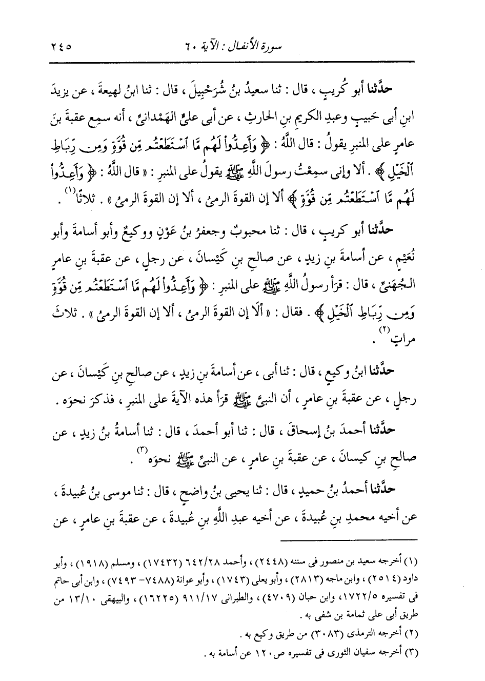 حَدَّثَنَا أَبُو كُرَيْبٍ، قَالَ: ثنا مَحْبُوبٌ وَجَعْفَرُ بْنُ عَوْنٍ وَوَكِيعٌ وَأَبُو أُسَامَةَ وَأَبُو نُعَيْمٍ، عَنْ أُسَامَةَ بْنِ زَيْدٍ، عَنْ صَالِحِ بْنِ كَيْسَانَ، عَنْ رَجُلٍ، عَنْ عُقْبَةَ بْنِ عَامِرٍ الْجُهَنِيِّ قَالَ: قَرَأَ رَسُولُ اللَّهِ صَلَّى اللهُ عَلَيْهِ وَسَلَّمَ عَلَى الْمِنْبَرِ: {§وَأَعِدُّوا لَهُمْ مَا اسْتَطَعْتُمْ مِنْ قُوَّةٍ وَمِنْ رِبَاطِ الْخَيْلِ} [الأنفال: 60] فَقَالَ: «أَلَا إِنَّ الْقُوَّةَ الرَّمْيُ، أَلَا إِنَّ الْقُوَّةَ الرَّمْيُ» ثَلَاثَ مَرَّاتٍ ". حَدَّثَنَا ابْنُ وَكِيعٍ، قَالَ: ثنا أَبِي، عَنْ أُسَامَةَ بْنِ زَيْدٍ، عَنْ صَالِحِ بْنِ كَيْسَانَ، عَنْ رَجُلٍ، عَنْ عُقْبَةَ بْنِ عَامِرٍ، أَنَّ النَّبِيَّ صَلَّى اللهُ عَلَيْهِ وَسَلَّمَ قَرَأَ هَذِهِ الْآيَةَ عَلَى الْمِنْبَرِ، فَذَكَرَ نَحْوَهُ. حَدَّثَنَا أَحْمَدُ بْنُ إِسْحَاقَ، قَالَ: ثنا أَبُو أَحْمَدَ، قَالَ: ثنا أُسَامَةُ بْنُ زَيْدٍ، عَنْ صَالِحِ بْنِ كَيْسَانَ، عَنْ عُقْبَةَ بْنِ عَامِرٍ، عَنِ النَّبِيِّ صَلَّى اللهُ عَلَيْهِ وَسَلَّمَ نَحْوَهُ