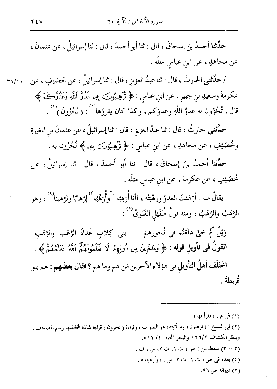 حَدَّثَنِي الْحَارِثُ، قَالَ: ثنا عَبْدُ الْعَزِيزِ، قَالَ: ثنا إِسْرَائِيلُ، عَنْ عُثْمَانَ بْنِ الْمُغِيرَةِ وَخُصَيْفٍ، عَنْ مُجَاهِدٍ، عَنِ ابْنِ عَبَّاسٍ: " {§تُرْهِبُونَ بِهِ} [الأنفال: 60] تُخْزُونَ بِهِ ". حَدَّثَنَا أَحْمَدُ بْنُ إِسْحَاقَ، قَالَ: ثنا أَبُو أَحْمَدَ، قَالَ: ثنا إِسْرَائِيلُ، عَنْ خُصَيْفٍ، عَنْ عِكْرِمَةَ، عَنِ ابْنِ عَبَّاسٍ مِثْلَهُ يُقَالُ مِنْهُ: أَرْهَبْتُ الْعَدُوَّ وَرَهَّبْتُهُ، فَأَنَا أُرْهِبُهُ وَأُرَهِّبُهُ إِرْهَابًا وَتَرْهِيبًا، وَهُوَ الرَّهَبُ وَالرُّهْبُ، وَمِنْهُ قَوْلُ طُفَيْلٍ الْغَنَوِيِّ:
