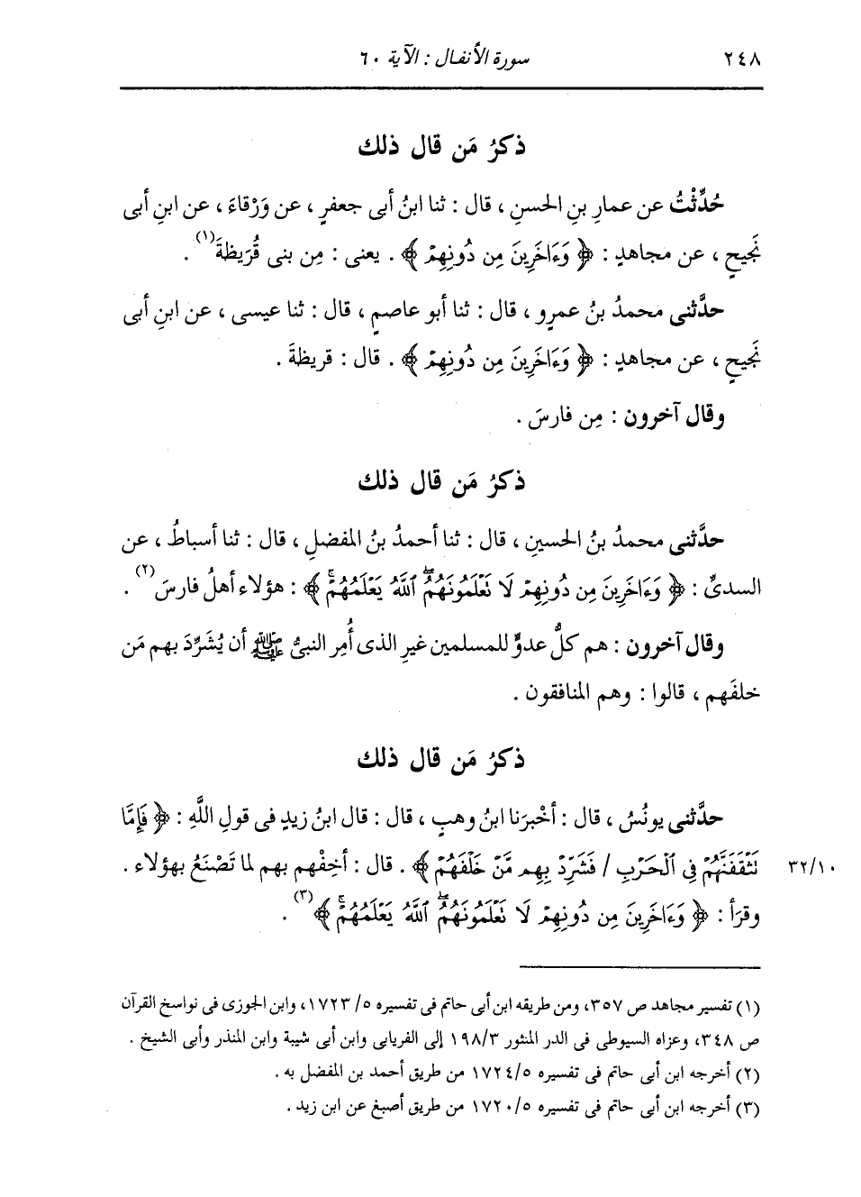 ذِكْرُ مَنْ قَالَ ذَلِكَ: حَدَّثَنِي مُحَمَّدُ بْنُ الْحُسَيْنِ، قَالَ: ثنا أَحْمَدُ بْنُ الْمُفَضَّلِ، قَالَ: ثنا أَسْبَاطٌ، عَنِ السُّدِّيِّ: " {§وَآخَرِينَ مِنْ دُونِهِمْ لَا تَعْلَمُونَهُمُ اللَّهُ يَعْلَمُهُمْ} [الأنفال: 60] هَؤُلَاءِ أَهْلُ فَارِسَ " وَقَالَ آخَرُونَ: هُمْ كُلُّ عَدُوٍّ لِلْمُسْلِمِينَ غَيْرُ الَّذِي أَمَرَ النَّبِيُّ صَلَّى اللهُ عَلَيْهِ وَسَلَّمَ أَنْ يُشَرِّدَ بِهِمْ مَنْ خَلْفَهُمْ. قَالُوا: وَهُمُ الْمُنَافِقُونَ