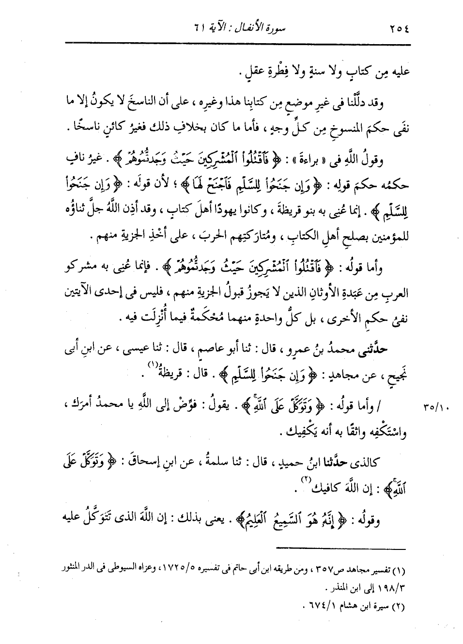 كَالَّذِي: حَدَّثَنَا ابْنُ حُمَيْدٍ، قَالَ: ثنا سَلَمَةُ، عَنِ ابْنِ إِسْحَاقَ: " {§وَتَوَكَّلْ عَلَى اللَّهِ} [الأنفال: 61] إِنَّ اللَّهَ كَافِيكَ "