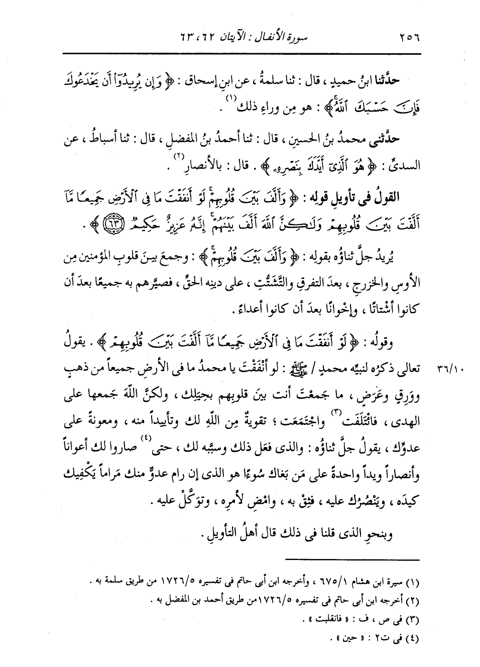 §الْقَوْلُ فِي تَأْوِيلِ قَوْلِهِ تَعَالَى: {وَأَلَّفَ بَيْنَ قُلُوبِهِمْ لَوْ أَنْفَقْتَ مَا فِي الْأَرْضِ جَمِيعًا مَا أَلَّفْتَ بَيْنَ قُلُوبِهِمْ وَلَكِنَّ اللَّهَ أَلَّفَ بَيْنَهُمْ إِنَّهُ عَزِيزٌ حَكِيمٌ} [الأنفال: 63] يُرِيدُ جَلَّ ثَنَاؤُهُ بِقَوْلِهِ: {وَأَلَّفَ بَيْنَ قُلُوبِهِمْ} [الأنفال: 63] وَجَمَعَ بَيْنَ قُلُوبِ الْمُؤْمِنِينَ مِنَ الْأَوْسِ وَالْخَزْرَجِ بَعْدَ التَّفَرُّقِ وَالتَّشَتُّتِ عَلَى دِينِهِ الْحَقِّ، فَصَيَّرَهُمْ بِهِ جَمِيعًا بَعْدَ أَنْ كَانُوا أَشْتَاتًا، وَإِخْوَانًا بَعْدَ أَنْ كَانُوا أَعْدَاءً