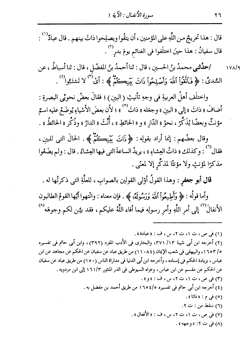 حَدَّثَنِي مُحَمَّدُ بْنُ الْحُسَيْنِ، قَالَ: ثنا أَحْمَدُ بْنُ الْمُفَضَّلِ، قَالَ: ثنا أَسْبَاطٌ، عَنِ السُّدِّيِّ: " {§فَاتَّقُوا اللَّهَ وَأَصْلِحُوا ذَاتَ بَيْنِكُمْ} [الأنفال: 1] أَيْ: لَا تَسْتَبُّوا " وَاخْتَلَفَ أَهْلُ الْعَرَبِيَّةِ فِي وَجْهِ تَأْنِيثِ الْبَيْنِ، فَقَالَ بَعْضُ نَحْوِيِّي الْبَصْرَةِ: أَضَافَ ذَاتَ إِلَى الْبَيْنِ وَجَعَلَهُ ذَاتًا؛ لِأَنَّ بَعْضَ الْأَشْيَاءِ يُوضَعُ عَلَيْهِ اسْمٌ مُؤَنَّثٌ، وَبَعْضًا يُذَكَّرُ نَحْوُ الدَّارِ، وَالْحَائِطِ أَنَّثَ الدَّارَ وَذَكَّرَ الْحَائِطَ. وَقَالَ بَعْضُهُمْ: إِنَّمَا أَرَادَ بِقَوْلِهِ: {ذَاتَ بَيْنِكُمْ} [الأنفال: 1] الْحَالَ الَّتِي لِلْبَيْنِ فَقَالَ: وَكَذَلِكَ «ذَاتُ الْعَشَاءِ» يُرِيدُ السَّاعَةَ الَّتِي فِيهَا الْعَشَاءُ. قَالَ: وَلَمْ يَضَعُوا مُذَكَّرًا لِمُؤَنَّثٍ وَلَا مُؤَنَّثًا لِمُذَكَّرٍ إِلَّا لِمَعْنَى. قَالَ أَبُو جَعْفَرٍ: هَذَا الْقَوْلُ أَوْلَى الْقَوْلَيْنِ بِالصَّوَابِ لِلْعِلَّةِ الَّتِي ذَكَرْتُهَا لَهُ