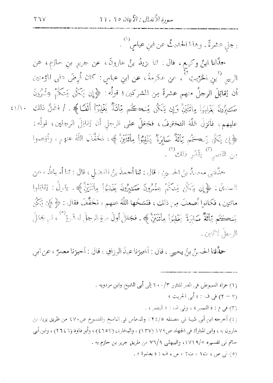حَدَّثَنَا ابْنُ وَكِيعٍ، قَالَ: ثنا يَزِيدُ بْنُ هَارُونَ، عَنْ جَرِيرِ بْنِ حَازِمٍ، عَنِ الزُّبَيْرِ بْنِ الْخِرِّيتِ، عَنْ عِكْرِمَةَ، عَنِ ابْنِ عَبَّاسٍ: " §كَانَ فُرِضَ عَلَى الْمُؤْمِنِينَ أَنْ يُقَاتِلَ الرَّجُلُ مِنْهُمْ عَشَرَةً مِنَ الْمُشْرِكِينَ، قَوْلُهُ: {إِنْ يَكُنْ مِنْكُمْ عِشْرُونَ صَابِرُونَ يَغْلِبُوا مِائَتَيْنِ وَإِنْ يَكُنْ مِنْكُمْ مِائَةٌ يَغْلِبُوا أَلْفًا} فَشَقَّ ذَلِكَ عَلَيْهِمْ، فَأَنْزَلَ اللَّهُ التَّخْفِيفَ، فَجُعِلَ عَلَى الرَّجُلِ أَنْ يُقَاتِلَ الرَّجُلَيْنِ، قَوْلُهُ: {فَإِنْ يَكُنْ مِنْكُمْ مِائَةٌ صَابِرَةٌ يَغْلِبُوا مِائَتَيْنِ} فَخَفَّفَ اللَّهُ عَنْهُمْ، وَنُقِصُوا مِنَ الصَّبْرِ بِقَدْرِ ذَلِكَ "