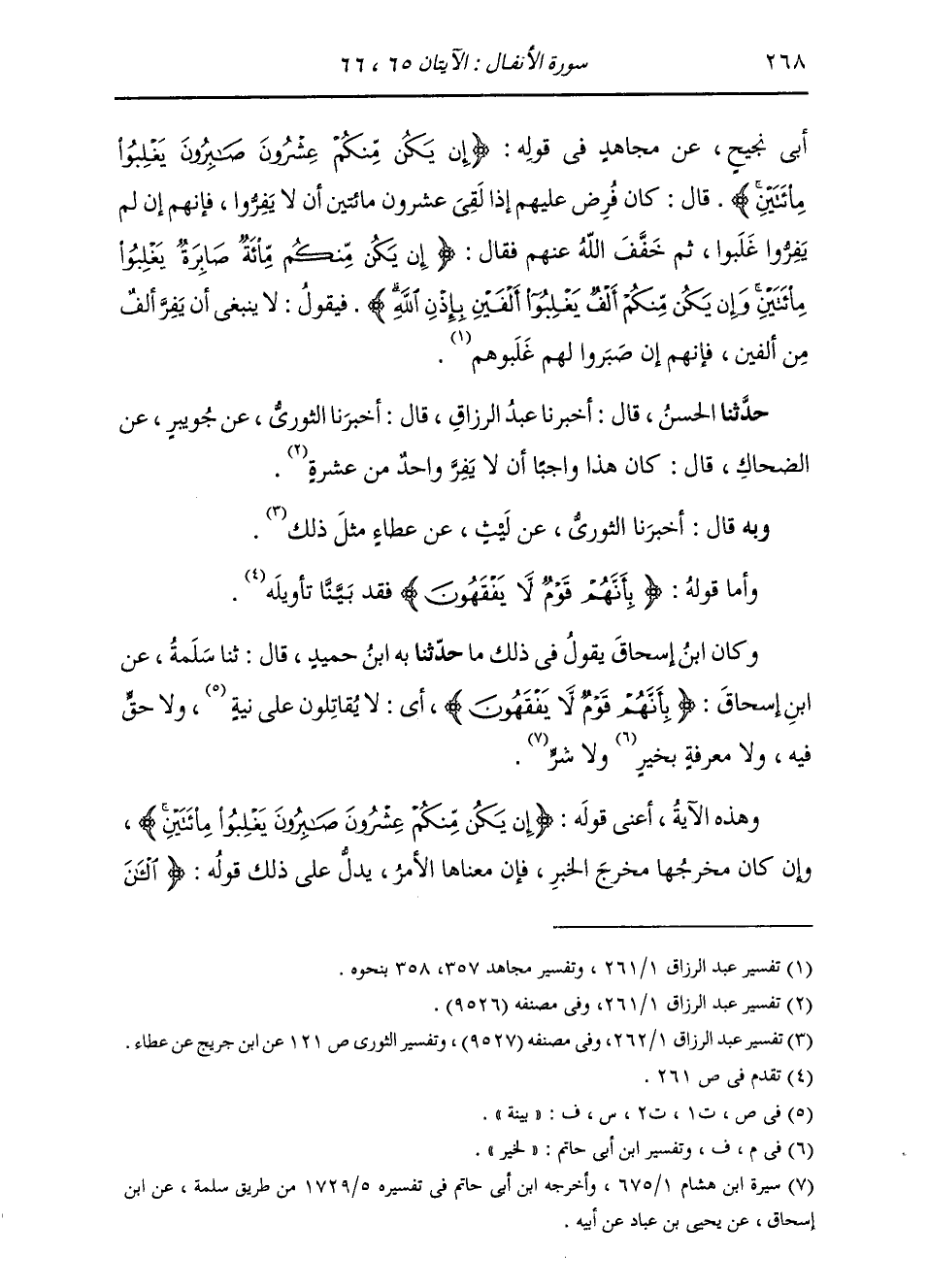 وَكَانَ ابْنُ إِسْحَاقَ يَقُولُ فِي ذَلِكَ مَا: حَدَّثَنَا بِهِ ابْنُ حُمَيْدٍ، قَالَ: ثنا سَلَمَةُ، عَنِ ابْنِ إِسْحَاقَ: " {§بِأَنَّهُمْ قَوْمٌ لَا يَفْقَهُونَ} [الأنفال: 65] أَيْ لَا يُقَاتِلُونَ عَلَى نِيَّةٍ، وَلَا حَقٍّ فِيهِ، وَلَا مَعْرِفَةٍ لَخَيْرٍ وَلَا شَرٍّ " وَهَذِهِ الْآيَةُ، أَعْنِي قَوْلَهُ: {إِنْ يَكُنْ مِنْكُمْ عِشْرُونَ صَابِرُونَ يَغْلِبُوا مِائَتَيْنِ} وَإِنْ كَانَ مَخْرَجُهَا مَخْرَجَ الْخَبَرِ، فَإِنَّ مَعْنَاهَا الْأَمْرُ، يَدُلُّ عَلَى ذَلِكَ قَوْلُهُ: {الْآنَ