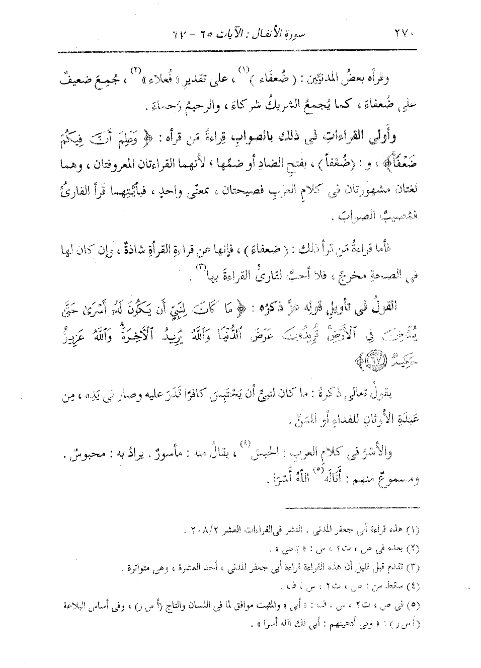 §الْقَوْلُ فِي تَأْوِيلِ قَوْلِهِ تَعَالَى: {مَا كَانَ لِنَبِيٍّ أَنْ يَكُونَ لَهُ أَسْرَى حَتَّى يُثْخِنَ فِي الْأَرْضِ تُرِيدُونَ عَرَضَ الدُّنْيَا وَاللَّهُ يُرِيدُ الْآخِرَةَ وَاللَّهُ عَزِيزٌ حَكِيمٌ} [الأنفال: 67] يَقُولُ تَعَالَى ذِكْرُهُ: مَا كَانَ لِنَبِيٍّ أَنْ يَحْتَبِسَ كَافِرًا قَدِرَ عَلَيْهِ وَصَارَ فِي يَدِهِ مِنْ عَبَدَةِ الْأَوْثَانِ لِلْفِدَاءِ أَوْ لِلْمَنِّ. وَالْأَسْرُ فِي كَلَامِ الْعَرَبِ: الْحَبْسُ، يُقَالُ مِنْهُ: مَأْسُورٌ، يُرَادُ بِهِ: مَحْبُوسٌ، وَمَسْمُوعٌ مِنْهُمْ: أَنَالَهُ اللَّهُ أُسْرًا. -[271]- وَإِنَّمَا قَالَ اللَّهُ جَلَّ ثَنَاؤُهُ لِنَبِيِّهِ مُحَمَّدٍ صَلَّى اللهُ عَلَيْهِ وَسَلَّمَ يُعَرِّفُهُ أَنَّ قَتْلَ الْمُشْرِكِينَ الَّذِينَ أَسْرَهُمْ صَلَّى اللهُ عَلَيْهِ وَسَلَّمَ يَوْمَ بَدْرٍ ثُمَّ فَادَى بِهِمْ كَانَ أَوْلَى بِالصَّوَابِ مِنْ أَخْذِ الْفِدْيَةِ مِنْهُمْ وَإِطْلَاقِهِمْ