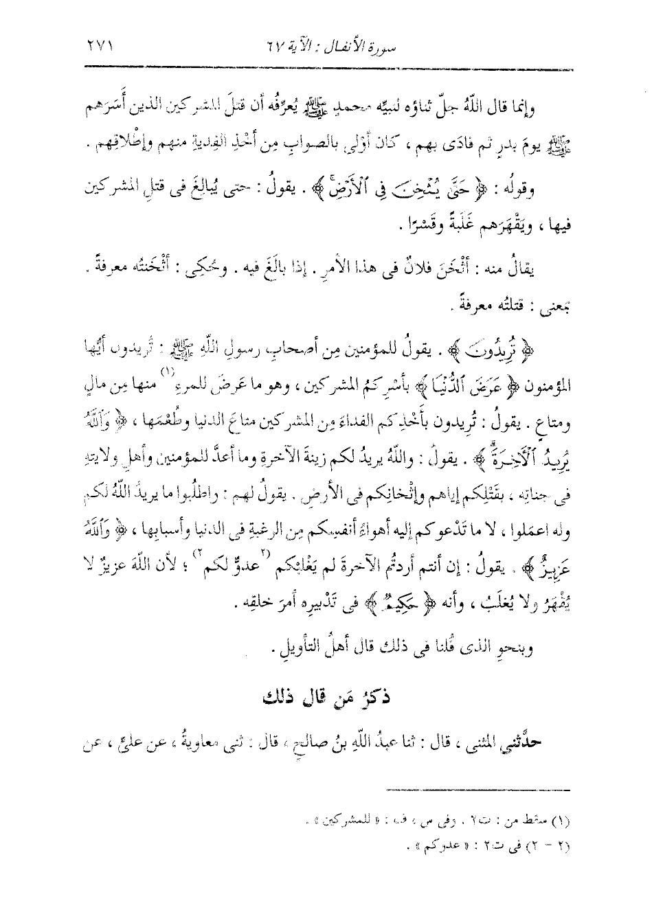ذِكْرُ مَنْ قَالَ ذَلِكَ: حَدَّثَنِي الْمُثَنَّى، قَالَ: ثنا عَبْدُ اللَّهِ بْنُ صَالِحٍ، قَالَ: ثني مُعَاوِيَةُ، عَنْ عَلِيٍّ، عَنِ -[272]- ابْنِ عَبَّاسٍ، قَوْلُهُ: " {§مَا كَانَ لِنَبِيٍّ أَنْ يَكُونَ لَهُ أَسْرَى حَتَّى يُثْخِنَ فِي الْأَرْضِ} [الأنفال: 67] وَذَلِكَ يَوْمُ بَدْرٍ وَالْمُسْلِمُونَ يَوْمَئِذٍ قَلِيلٌ، فَلَمَّا كَثُرُوا وَاشْتَدَّ سُلْطَانُهُمْ، أَنْزَلَ اللَّهُ تَبَارَكَ وَتَعَالَى بَعْدَ هَذَا فِي الْأُسَارَى: {فَإِمَّا مَنًّا بَعْدُ وَإِمَّا فِدَاءً} [محمد: 4] فَجَعَلَ اللَّهُ النَّبِيَّ وَالْمُؤْمِنِينَ فِي أَمْرِ الْأُسَارَى بِالْخِيَارِ، إِنْ شَاءُوا قَتَلُوهُمْ وَإِنْ شَاءُوا استعْبَدُوهُمْ وَإِنْ شَاءُوا فَادُوهُمْ "