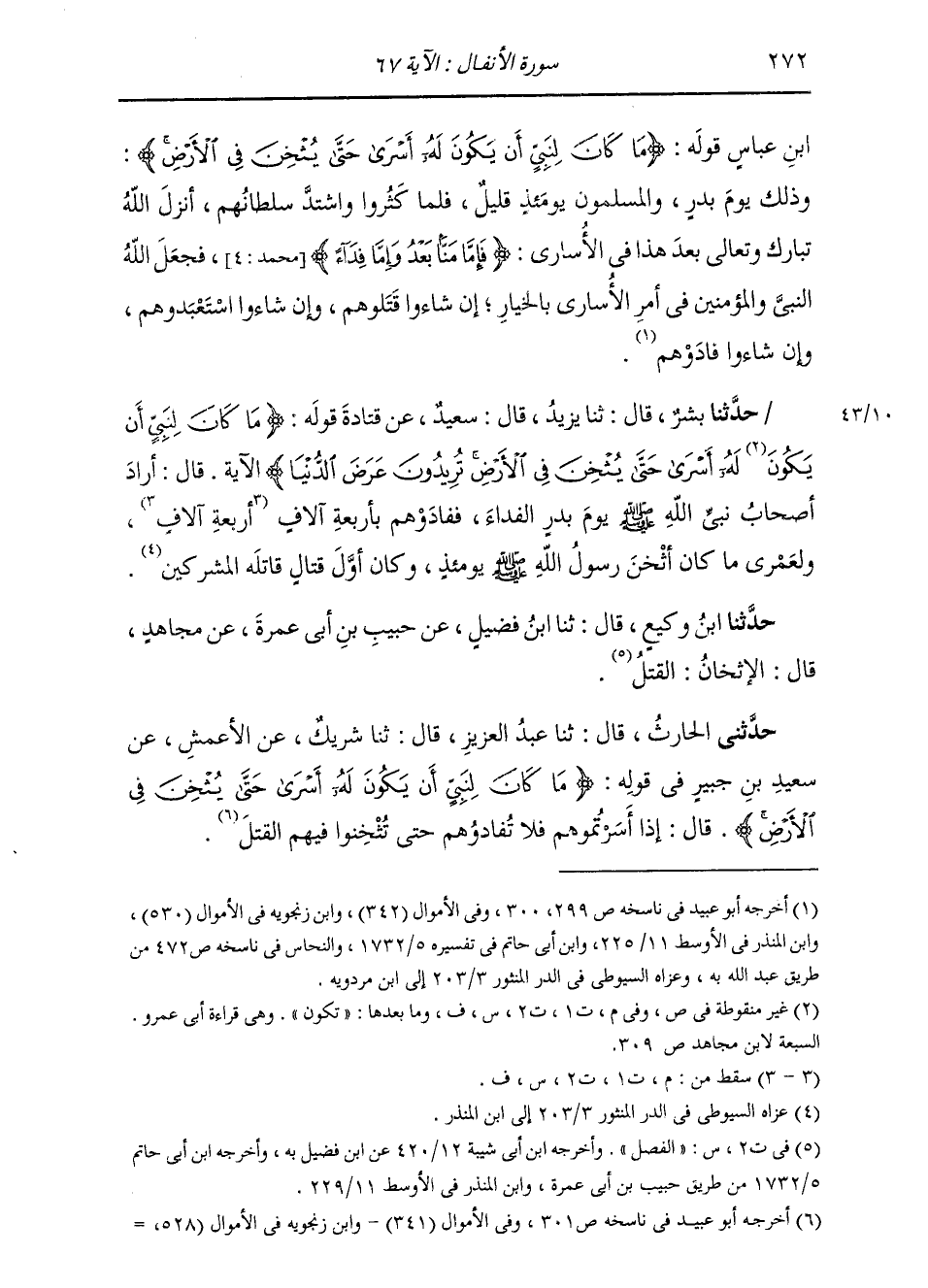 حَدَّثَنَا بِشْرٌ، قَالَ: ثنا يَزِيدُ، قَالَ: ثنا سَعِيدٌ، عَنْ قَتَادَةَ، قَوْلُهُ: " {§مَا كَانَ لِنَبِيٍّ أَنْ يَكُونَ لَهُ أَسْرَى حَتَّى يُثْخِنَ فِي الْأَرْضِ تُرِيدُونَ عَرَضَ الدُّنْيَا} [الأنفال: 67] الْآيَةَ، قَالَ: أَرَادَ أَصْحَابُ نَبِيِّ اللَّهِ صَلَّى اللهُ عَلَيْهِ وَسَلَّمَ يَوْمَ بَدْرٍ الْفِدَاءَ، فَفَادُوهُمْ بِأَرْبَعَةِ آلَافٍ، وَلَعَمْرِي مَا كَانَ أَثْخَنَ رَسُولُ اللَّهِ صَلَّى اللهُ عَلَيْهِ وَسَلَّمَ يَوْمَئِذٍ، وَكَانَ أَوَّلَ قِتَالٍ قَاتَلَهُ الْمُشْرِكِينَ "