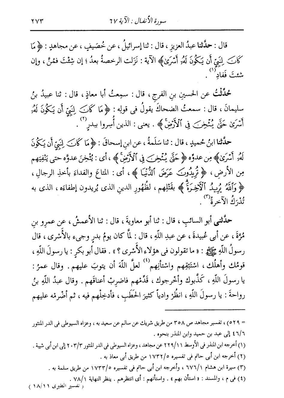 حَدَّثَنَا ابْنُ حُمَيْدٍ، قَالَ: ثنا سَلَمَةُ، عَنِ ابْنِ إِسْحَاقَ: " {§مَا كَانَ لِنَبِيٍّ أَنْ يَكُونَ لَهُ أَسْرَى} [الأنفال: 67] مِنْ عَدُوِّهِ. {حَتَّى يُثْخِنَ فِي الْأَرْضِ} [الأنفال: 67] أَيْ يُثْخِنَ عَدُوَّهُ، حَتَّى يَنْفِيَهُمْ مِنَ الْأَرْضِ. {تُرِيدُونَ عَرَضَ الدُّنْيَا} [الأنفال: 67] أَيِ الْمَتَاعَ وَالْفِدَاءَ بِأَخْذِ الرِّجَالِ. {وَاللَّهُ يُرِيدُ الْآخِرَةَ} [الأنفال: 67] بِقَتْلِهِمْ لِظُهُورِ الدِّينَ الَّذِي يُرِيدُونَ إِطْفَاءَهُ، الَّذِي بِهِ تُدْرَكُ الْآخِرَةُ "
