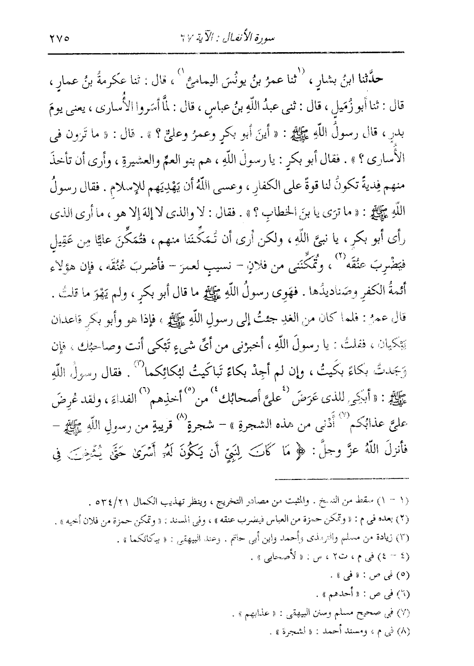 حَدَّثَنَا ابْنُ بَشَّارٍ، قَالَ: ثنا عِكْرِمَةُ بْنُ عَمَّارٍ، قَالَ: ثنا أَبُو زُمَيْلٍ، قَالَ: ثني عَبْدُ اللَّهِ بْنُ عَبَّاسٍ، قَالَ: لَمَّا أَسَرُوا الْأُسَارَى يَعْنِي يَوْمَ بَدْرٍ قَالَ رَسُولُ اللَّهِ صَلَّى اللهُ عَلَيْهِ وَسَلَّمَ: «§أَيْنَ أَبُو بَكْرٍ وَعُمَرُ وَعَلِيٌّ؟» قَالَ: «مَا تَرَوْنَ فِي الْأُسَارَى؟» فَقَالَ أَبُو بَكْرٍ: يَا رَسُولَ اللَّهِ هُمْ بَنُو الْعَمِّ وَالْعَشِيرَةِ، وَأَرَى أَنْ تَأْخُذَ مِنْهُمْ فِدْيَةً تَكُونُ لَنَا قُوَّةً عَلَى الْكُفَّارِ، وَعَسَى اللَّهُ أَنْ يَهْدِيَهُمْ لِلْإِسْلَامِ. فَقَالَ رَسُولُ اللَّهِ صَلَّى اللهُ عَلَيْهِ وَسَلَّمَ: «مَا تَرَى يَا ابْنَ الْخَطَّابِ؟» فَقَالَ: لَا وَالَّذِي لَا إِلَهَ إِلَّا هُوَ مَا أَرَى الَّذِي رَأَى أَبُو بَكْرٍ يَا نَبِيَّ اللَّهِ، وَلَكِنْ أَرَى أَنَّ تُمَكِّنَنَا مِنْهُمْ، فَتُمَكِّنَ عَلِيًّا مِنْ عَقِيلٍ فَيَضْرِبَ عُنُقَهُ، وَتُمَكِّنَ حَمْزَةَ مِنَ الْعَبَّاسِ فَيَضْرِبَ عُنُقَهُ، وَتُمَكِّنَنِي مِنْ فُلَانٍ نَسِيبٍ لِعُمَرَ فَأَضْرِبَ عُنُقَهُ، فَإِنَّ هَؤُلَاءِ أَئِمَّةُ الْكُفْرِ وَصَنَادِيدُهَا. فَهَوِيَ رَسُولُ اللَّهِ صَلَّى اللهُ عَلَيْهِ وَسَلَّمَ مَا قَالَ أَبُو بَكْرٍ، وَلَمْ يَهْوَ مَا قُلْتُ. قَالَ عُمَرُ: فَلَمَّا كَانَ مِنَ الْغَدِ جِئْتُ إِلَى رَسُولِ اللَّهِ صَلَّى اللهُ عَلَيْهِ وَسَلَّمَ، فَإِذَا هُوَ وَأَبُو بَكْرٍ قَاعِدَانِ يَبْكِيَانِ، فَقُلْتُ: يَا رَسُولَ اللَّهِ أَخْبِرْنِي مِنْ أَيِّ شَيْءٍ تَبْكِي أَنْتَ وَصَاحِبُكَ، فَإِنْ وَجَدْتُ بُكَاءً بَكَيْتُ وَإِنْ لَمْ أَجِدْ بُكَاءً تَبَاكَيْتُ، فَقَالَ رَسُولُ اللَّهِ صَلَّى اللهُ عَلَيْهِ وَسَلَّمَ: «أَبْكِي لِلَّذِي عُرِضَ لِأَصْحَابِي مِنْ أَخَذِهِمُ الْفِدَاءَ، وَلَقَدْ عُرِضَ عَلَيَّ عَذَابُكُمْ أَدْنَى مِنْ هَذِهِ الشَّجَرَةِ» لِشَجَرَةٍ قَرِيبَةٍ مِنْ رَسُولِ اللَّهِ صَلَّى اللهُ عَلَيْهِ وَسَلَّمَ فَأَنْزَلَ اللَّهُ عَزَّ وَجَلَّ {مَا كَانَ لِنَبِيٍّ أَنْ يَكُونَ لَهُ أَسْرَى حَتَّى يُثْخِنَ فِي -[276]- الْأَرْضِ} [الأنفال: 67] إِلَى قَوْلِهِ: {حَلَالًا طَيِّبًا} [البقرة: 168] وَأَحَلَّ اللَّهُ الْغَنِيمَةَ لَهُمْ "