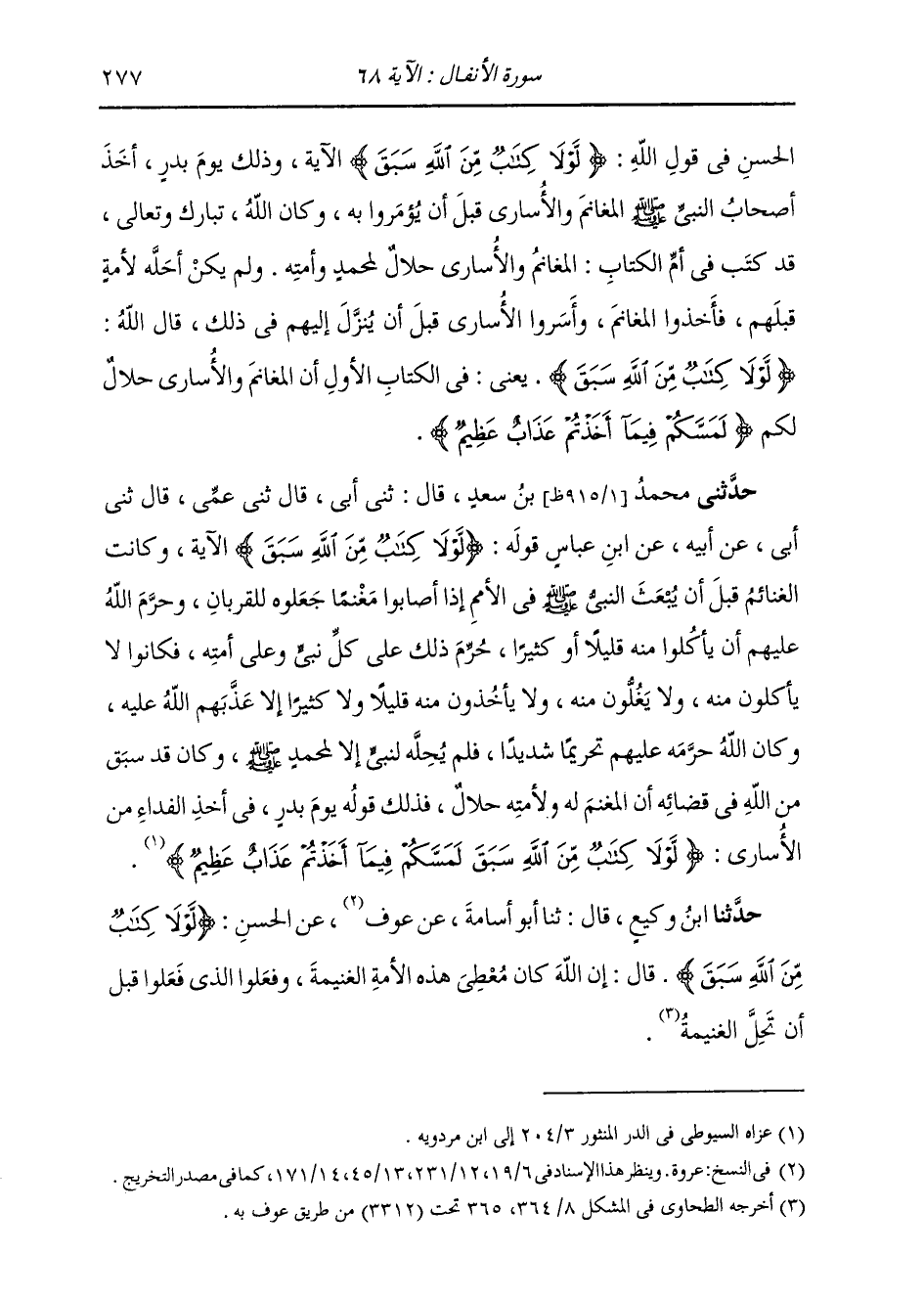 حَدَّثَنِي مُحَمَّدُ بْنُ سَعْدٍ، قَالَ: ثني أَبِي، قَالَ: ثني عَمِّي، قَالَ: ثني أَبِي، عَنْ أَبِيهِ، عَنِ ابْنِ عَبَّاسٍ، قَوْلُهُ: " {§لَوْلَا كِتَابٌ مِنَ اللَّهِ سَبَقَ} [الأنفال: 68] الْآيَةَ، وَكَانَتِ الْغَنَائِمُ قَبْلَ أَنْ يُبْعَثَ النَّبِيُّ صَلَّى اللهُ عَلَيْهِ وَسَلَّمَ فِي الْأُمَمِ إِذَا أَصَابُوا مَغْنَمًا جَعَلُوهُ لِلْقُرْبَانِ، وَحَرَّمَ اللَّهُ عَلَيْهِمْ أَنْ يَأْكُلُوا مِنْهُ قَلِيلًا أَوْ كَثِيرًا، حَرَّمَ ذَلِكَ عَلَى كُلِّ نَبِيٍّ وَعَلَى أُمَّتِهِ، فَكَانُوا لَا يَأْكُلُونَ مِنْهُ وَلَا يَغُلُّونَ مِنْهُ وَلَا يَأْخُذُونَ مِنْهُ قَلِيلًا وَلَا كَثِيرًا إِلَّا عَذَّبَهُمُ اللَّهُ عَلَيْهِ. وَكَانَ اللَّهُ حَرَّمَهُ عَلَيْهِمْ تَحْرِيمًا شَدِيدًا، فَلَمْ يُحِلَّهُ لِنَبِيٍّ إِلَّا لِمُحَمَّدٍ صَلَّى اللهُ عَلَيْهِ وَسَلَّمَ. وَكَانَ قَدْ سَبَقَ مِنَ اللَّهِ فِي قَضَائِهِ أَنَّ الْمَغْنَمَ لَهُ وَلِأُمَّتِهِ حَلَالٌ، فَذَلِكَ قَوْلُهُ يَوْمَ بَدْرٍ فِي أَخْذِ الْفِدَاءِ مِنَ الْأُسَارَى: {لَوْلَا كِتَابٌ مِنَ اللَّهِ سَبَقَ لَمَسَّكُمْ فِيمَا أَخَذْتُمْ عَذَابٌ عَظِيمٌ} [الأنفال: 68] "