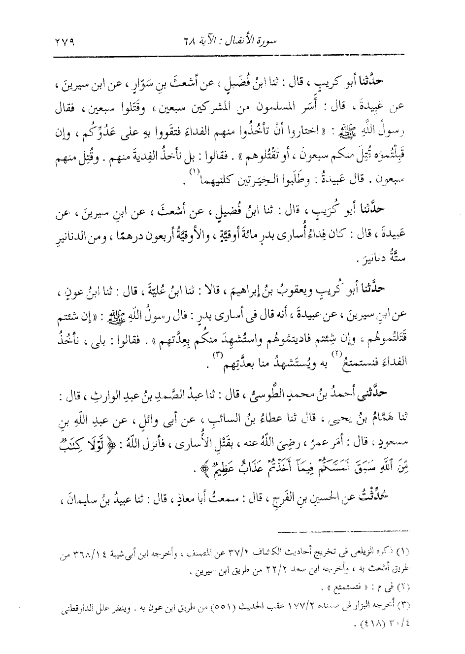 حَدَّثَنَا أَبُو كُرَيْبٍ، قَالَ: ثنا ابْنُ فُضَيْلٍ، عَنْ أَشْعَثَ بْنِ سَوَّارٍ، عَنِ ابْنِ سِيرِينَ، عَنْ عَبِيدَةَ، قَالَ: §أَسَرَ الْمُسْلِمُونَ مِنَ الْمُشْرِكِينَ سَبْعِينَ وَقَتَلُوا سَبْعِينَ، فَقَالَ رَسُولُ اللَّهِ صَلَّى اللهُ عَلَيْهِ وَسَلَّمَ: «اخْتَارُوا أَنْ تَأَخُذُوا مِنْهُمُ الْفِدَاءَ فَتَقْوَوْا بِهِ عَلَى عَدُوِّكُمْ، وَإِنْ قَبِلْتُمُوهُ قُتِلَ مِنْكُمْ سَبْعُونَ، أَوْ تَقْتُلُوهُمْ» فَقَالُوا: بَلْ نَأْخُذُ الْفِدْيَةَ مِنْهُمْ، وَقُتِلَ مِنْهُمْ سَبْعُونَ. قَالَ عُبَيْدَةُ: وَطَلَبُوا الْخَيْرَتَيْنِ كِلْتَيْهِمَا