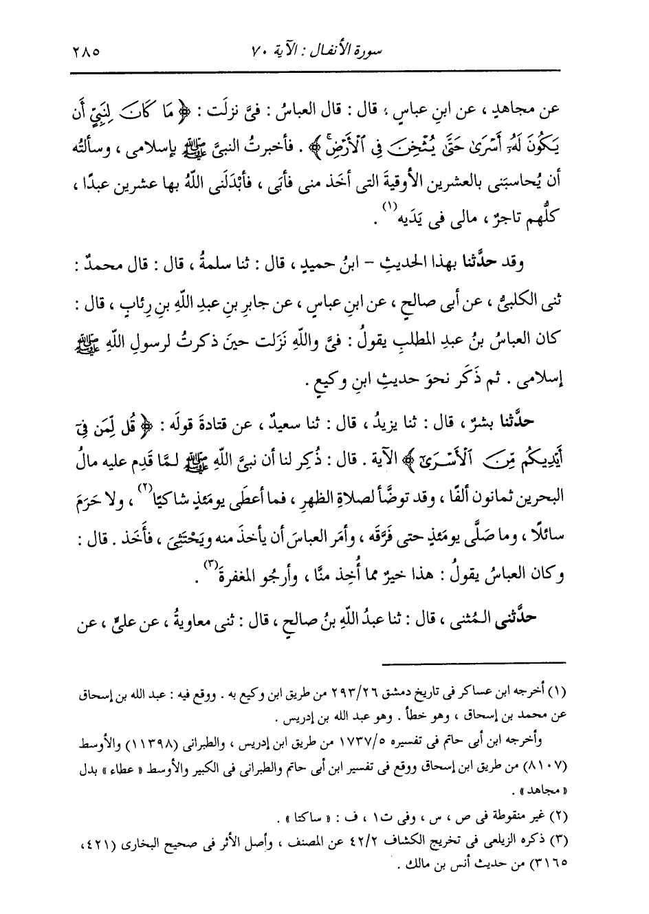 حَدَّثَنِي الْمُثَنَّى، قَالَ: ثنا عَبْدُ اللَّهِ بْنُ صَالِحٍ، قَالَ: ثني مُعَاوِيَةُ، عَنْ عَلِيٍّ، عَنِ -[286]- ابْنِ عَبَّاسٍ، قَوْلُهُ: {يَا أَيُّهَا النَّبِيُّ قُلْ لِمَنْ فِي أَيْدِيكُمْ مِنَ الْأَسْرَى} [الأنفال: 70] الْآيَةَ، وَكَانَ الْعَبَّاسُ أُسِرَ يَوْمَ بَدْرٍ، فَافْتَدَى نَفْسَهُ بِأَرْبَعِينَ أُوقِيَّةً مِنْ ذَهَبٍ، فَقَالَ الْعَبَّاسُ حِينَ نَزَلَتْ هَذِهِ الْآيَةُ: " §لَقَدْ أَعْطَانِي اللَّهُ خَصْلَتَيْنِ مَا أُحِبُّ أَنَّ لِيَ بِهِمَا الدُّنْيَا: إِنِّي أُسِرْتُ يَوْمَ بَدْرٍ فَفَدَيْتُ نَفْسِي بِأَرْبَعِينَ أُوقِيَّةً، فَآتَانِي أَرْبَعِينَ عَبْدًا وَأَنَا أَرْجُو الْمَغْفِرَةَ الَّتِي وَعَدَنَا اللَّهُ "