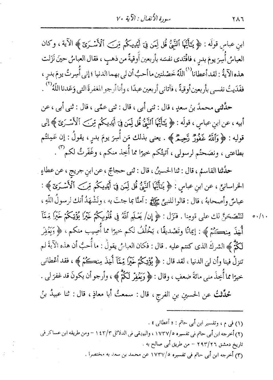 حَدَّثَنِي مُحَمَّدُ بْنُ سَعْدٍ، قَالَ: ثني أَبِي، قَالَ: ثني عَمِّي، قَالَ: ثني أَبِي، عَنْ أَبِيهِ، عَنِ ابْنِ عَبَّاسٍ، قَوْلُهُ: " {§يَا أَيُّهَا النَّبِيُّ قُلْ لِمَنْ فِي أَيْدِيكُمْ مِنَ الْأَسْرَى} [الأنفال: 70] إِلَى قَوْلِهِ: {وَاللَّهُ غَفُورٌ رَحِيمٌ} [البقرة: 218] يَعْنِي بِذَلِكَ مَنْ أُسِرَ يَوْمَ بَدْرٍ، يَقُولُ: إِنْ عَمِلْتُمْ بِطَاعَتِي وَنَصَحْتُمْ لِرَسُولِي، أَتَيْتُكُمْ خَيْرًا مِمَّا أُخِذَ مِنْكُمْ وَغَفَرْتُ لَكُمْ "
