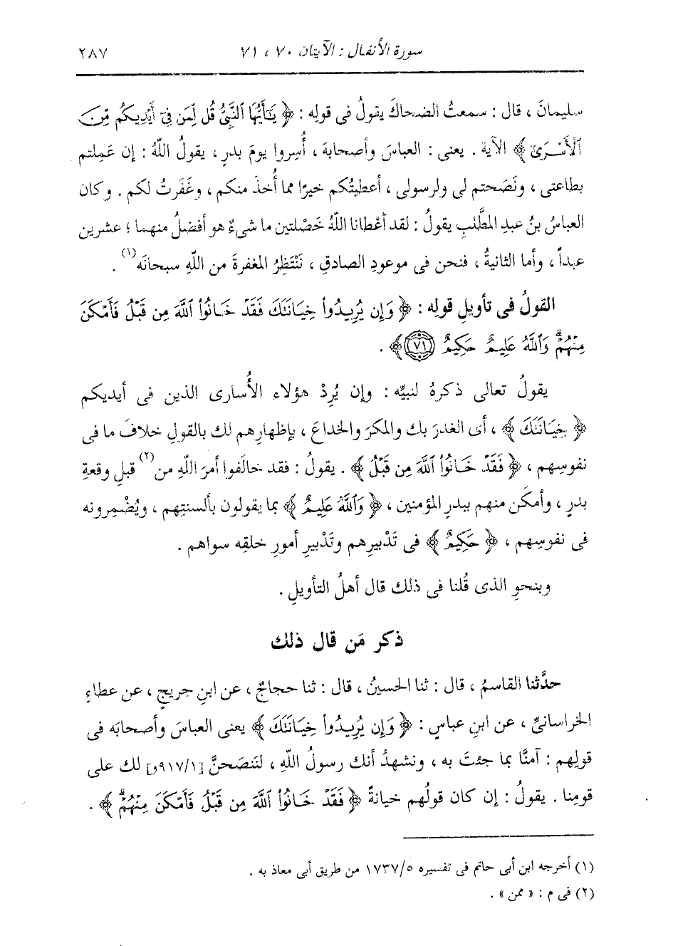 §الْقَوْلُ فِي تَأْوِيلِ قَوْلِهِ تَعَالَى: {وَإِنْ يُرِيدُوا خِيَانَتَكَ فَقَدْ خَانُوا اللَّهَ مِنْ قَبْلُ فَأَمْكَنَ مِنْهُمْ وَاللَّهُ عَلِيمٌ حَكِيم} [الأنفال: 71] يَقُولُ تَعَالَى ذِكْرُهُ لِنَبِيِّهِ: وَإِنْ يُرِدْ هَؤُلَاءِ الْأُسَارَى الَّذِينَ فِي أَيْدِيكُمْ خِيَانَتَكَ: أَيِ الْغَدْرَ بِكَ وَالْمَكْرَ وَالْخِدَاعَ، بِإِظْهَارِهِمْ لَكَ بِالْقَوْلِ خِلَافَ مَا فِي نُفُوسِهِمْ {فَقَدْ خَانُوا اللَّهَ مِنْ قَبْلُ} [الأنفال: 71] يَقُولُ: فَقَدْ خَالَفُوا أَمْرَ اللَّهِ مِمَّنْ قَبْلَ وَقْعَةِ بَدْرٍ، وَأَمْكَنَ مِنْهُمْ بِبَدْرٍ الْمُؤْمِنِينَ. {وَاللَّهُ عَلِيمٌ} [البقرة: 95] بِمَا يَقُولُونَ بِأَلْسِنَتِهِمْ وَيُضْمِرُونَهُ فِي نُفُوسِهِمْ، {حَكِيمٌ} [البقرة: 209] فِي تَدْبِيرِهِمْ وَتَدْبِيرِ أُمُورِ خَلْقِهِ سِوَاهُمْ. وَبِنَحْوِ الَّذِي قُلْنَا فِي ذَلِكَ قَالَ أَهْلُ التَّأْوِيلِ