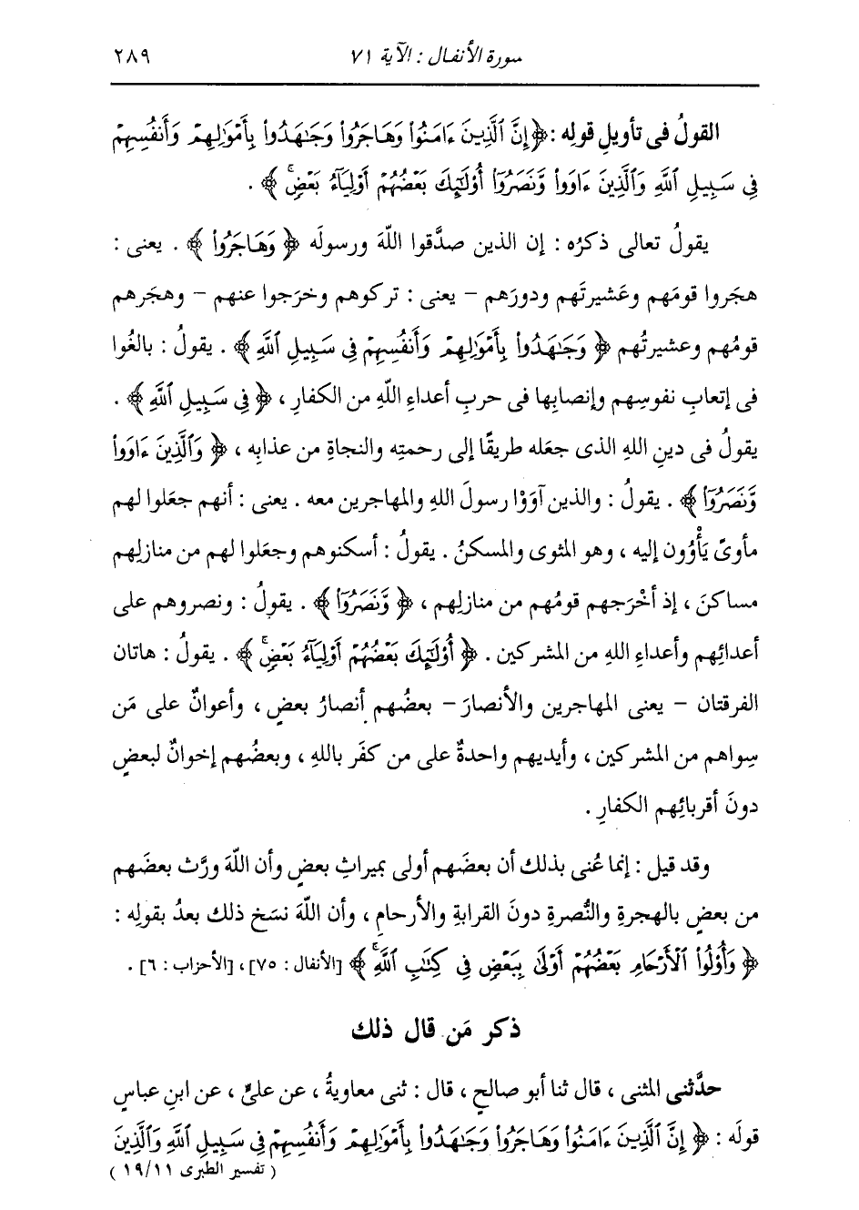 §الْقَوْلُ فِي تَأْوِيلِ قَوْلِهِ تَعَالَى: {إِنَّ الَّذِينَ آمَنُوا وَهَاجَرُوا وَجَاهَدُوا بِأَمْوَالِهِمْ وَأَنْفُسِهِمْ فِي سَبِيلِ اللَّهِ وَالَّذِينَ آوَوْا وَنَصَرُوا أُولَئِكَ بَعْضُهُمْ أَوْلِيَاءُ بَعْضٍ وَالَّذِينَ آمَنُوا وَلَمْ يُهَاجِرُوا مَا لَكُم مِّن وَلاَيَتِهِم مِّن شَيْءٍ حَتَّى يُهَاجِرُوا وَإِنِ اسْتَنصَرُوكُمْ فِي الدِّينِ فَعَلَيْكُمُ النَّصْرُ إِلاَّ عَلَى قَوْمٍ بَيْنَكُمْ وَبَيْنَهُم مِّيثَاقٌ وَاللَّهُ بِمَا تَعْمَلُونَ بَصِيرٌ} [الأنفال: 72] يَقُولُ تَعَالَى ذِكْرُهُ: إِنَّ الَّذِينَ صَدَّقُوا اللَّهَ وَرَسُولَهُ. {وَهَاجَرُوا} [الأنفال: 72] يَعْنِي: هَجَرُوا قَوْمَهُمْ وَعَشِيرَتَهُمْ وَدُورَهُمْ، يَعْنِي: تَرَكُوهُمْ وَخَرَجُوا عَنْهُمْ، وَهَجَرَهُمْ قَوْمُهُمْ وَعَشِيرَتُهُمْ. {وَجَاهَدُوا فِي سَبِيلِ اللَّهِ} [البقرة: 218] يَقُولُ: بَالَغُوا فِي إِتْعَابِ نُفُوسِهِمْ وَإِنْصَابِهَا فِي حَرْبِ أَعْدَاءِ اللَّهِ مِنَ الْكُفَّارِ فِي سَبِيلِ اللَّهِ، يَقُولُ فِي دِينِ اللَّهِ الَّذِي جَعَلَهُ طَرِيقًا إِلَى رَحْمَتِهِ وَالنَّجَاةَ مِنْ عَذَابِهِ. {وَالَّذِينَ آوَوْا وَنَصَرُوا} [الأنفال: 72] يَقُولُ: وَالَّذِينَ آوَوْا رَسُولَ اللَّهِ وَالْمُهَاجِرِينَ مَعَهُ، يَعْنِي أَنَّهُمْ جَعَلُوا لَهُمْ مَأْوًى يَأْوُونَ إِلَيْهِ، وَهُوَ الْمَثْوَى وَالْمَسْكَنُ، يَقُولُ: أَسْكَنُوهُمْ وَجَعَلُوا لَهُمْ مِنْ مَنَازِلِهِمْ مَسَاكِنَ؛ إِذْ أُخْرَجَهُمْ قَوْمُهُمْ مِنْ مَنَازِلِهِمْ {وَنَصَرُوا} [الأنفال: 72] يَقُولُ: وَنَصَرُوهُمْ عَلَى أَعْدَائِهِمْ وَأَعْدَاءِ اللَّهِ مِنَ الْمُشْرِكِينَ. {أُولَئِكَ بَعْضُهُمْ أَوْلِيَاءُ بَعْضٍ} [الأنفال: 72] يَقُولُ: هَاتَانِ الْفِرْقَتَانِ، يَعْنِي الْمُهَاجِرِينَ وَالْأَنْصَارَ، بَعْضُهُمْ أَنْصَارُ بَعْضٍ، وَأَعْوَانٌ عَلَى مَنْ سِوَاهُمْ مِنَ الْمُشْرِكِينَ، وَأَيْدِيهِمْ وَاحِدَةٌ عَلَى مَنْ كَفَرَ بِاللَّهِ، وَبَعْضُهُمْ إِخْوَانٌ لِبَعْضٍ دُونَ أَقْرِبَائِهِمُ الْكُفَّارِ. وَقَدْ قِيلَ: إِنَّمَا عَنَى بِذَلِكَ أَنَّ بَعْضَهُمْ أَوْلَى بِمِيرَاثِ بَعْضٍ، وَأَنَّ اللَّهَ وَرَّثَ بَعْضَهُمْ مِنْ بَعْضٍ بِالْهِجْرَةِ وَالنُّصْرَةِ دُونَ الْقَرَابَةِ وَالْأَرْحَامِ، وَأَنَّ اللَّهَ نَسْخَ ذَلِكَ بَعْدَ بِقَوْلِهِ: {وَأُولُو الْأَرْحَامِ بَعْضُهُمْ أَوْلَى بِبَعْضٍ فِي كِتَابِ اللَّهِ} [الأحزاب: 6]