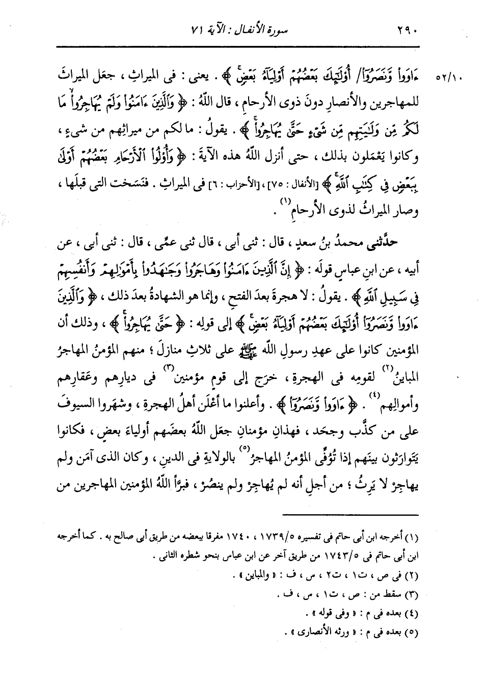 حَدَّثَنِي مُحَمَّدُ بْنُ سَعْدٍ، قَالَ: ثني أَبِي، قَالَ: ثني عَمِّي، قَالَ: ثني أَبِي، عَنْ أَبِيهِ، عَنِ ابْنِ عَبَّاسٍ، قَوْلُهُ: " {§إِنَّ الَّذِينَ آمَنُوا وَهَاجَرُوا وَجَاهَدُوا بِأَمْوَالِهِمْ وَأَنْفُسِهِمْ فِي سَبِيلِ اللَّهِ} [الأنفال: 72] يَقُولُ: لَا هِجْرَةَ بَعْدَ الْفَتْحِ، إِنَّمَا هُوَ الشَّهَادَةُ بَعْدَ ذَلِكَ {وَالَّذِينَ آوَوْا وَنَصَرُوا أُولَئِكَ بَعْضُهُمْ أَوْلِيَاءُ بَعْضٍ} [الأنفال: 72] إِلَى قَوْلِهِ: {حَتَّى يُهَاجِرُوا} [النساء: 89] وَذَلِكَ أَنَّ الْمُؤْمِنِينَ كَانُوا عَلَى عَهْدِ رَسُولِ اللَّهِ صَلَّى اللهُ عَلَيْهِ وَسَلَّمَ عَلَى ثَلَاثِ مَنَازِلَ. مِنْهُمُ الْمُؤْمِنُ الْمُهَاجِرُ الْمُبَايِنُ لِقَوْمِهِ فِي الْهِجْرَةِ، خَرَجَ إِلَى قَوْمٍ مُؤْمِنِينَ فِي دِيَارِهِمْ وَعَقَارِهِمْ وَأَمْوَالِهِمْ، وَ {آوَوْا وَنَصَرُوا} [الأنفال: 72] وَأَعْلَنُوا مَا أَعْلَنَ أَهْلُ الْهِجْرَةِ، وَشَهَرُوا السُّيُوفَ عَلَى مَنْ كَذَّبَ وَجَحَدَ، فَهَذَانِ مُؤْمِنَانِ جَعَلَ اللَّهُ بَعْضَهُمْ أَوْلِيَاءَ بَعْضٍ، فَكَانُوا يَتَوَارَثُونَ بَيْنَهُمْ إِذَا تُوُفِّيَ الْمُؤْمِنُ الْمُهَاجِرُ وَرِثَهُ الْأَنْصَارِيُّ بِالْوَلَايَةِ فِي الدِّينِ، وَكَانَ الَّذِي آمَنَ وَلَمْ يُهَاجِرْ لَا يَرِثُ مِنْ أَجْلِ أَنَّهُ لَمْ يُهَاجِرْ وَلَمْ يَنْصُرْ. فَبَرَّأَ اللَّهُ الْمُؤْمِنِينَ الْمُهَاجِرِينَ مِنْ -[291]- مِيرَاثِهِمْ، وَهِيَ الْوَلَايَةُ الَّتِي قَالَ اللَّهُ: {مَا لَكُمْ مِنْ وَلَايَتِهِمْ مِنْ شَيْءٍ حَتَّى يُهَاجِرُوا} [الأنفال: 72] وَكَانَ حَقًّا عَلَى الْمُؤْمِنِينَ الَّذِينَ آوَوْا وَنَصَرُوا إِذَا اسْتَنْصَرُوهُمْ فِي الدِّينِ أَنْ يَنْصُرُوهُمْ إِنْ قَاتَلُوا إِلَّا أَنْ يُسْتَنْصَرُوا عَلَى قَوْمٍ بَيْنَهُمْ وَبَيْنَ النَّبِيِّ صَلَّى اللهُ عَلَيْهِ وَسَلَّمَ مِيثَاقٌ، فَلَا نَصْرَ لَهُمْ عَلَيْهِمْ إِلَّا عَلَى الْعَدُوِّ الَّذِينَ لَا مِيثَاقَ لَهُمْ. ثُمَّ أَنْزَلَ اللَّهُ بَعْدَ ذَلِكَ أَنْ أَلْحِقْ كُلَّ ذِي رَحِمٍ بِرَحِمِهِ مِنَ الْمُؤْمِنِينَ الَّذِينَ هَاجَرُوا وَالَّذِينَ آمَنُوا وَلَمْ يُهَاجِرُوا، فَجَعَلَ لِكُلِّ إِنْسَانٍ مِنَ الْمُؤْمِنِينَ نَصِيبًا مَفْرُوضًا بِقَوْلِهِ: {وَأُولُو الْأَرْحَامِ بَعْضُهُمْ أَوْلَى بِبَعْضٍ فِي كِتَابِ اللَّهِ إِنَّ اللَّهَ بِكُلِّ شَيْءٍ عَلِيمٌ} ، وَبِقَوْلِهِ: {وَالْمُؤْمِنُونَ وَالْمُؤْمِنَاتُ بَعْضُهُمْ أَوْلِيَاءُ بَعْضٍ} [التوبة: 71] "