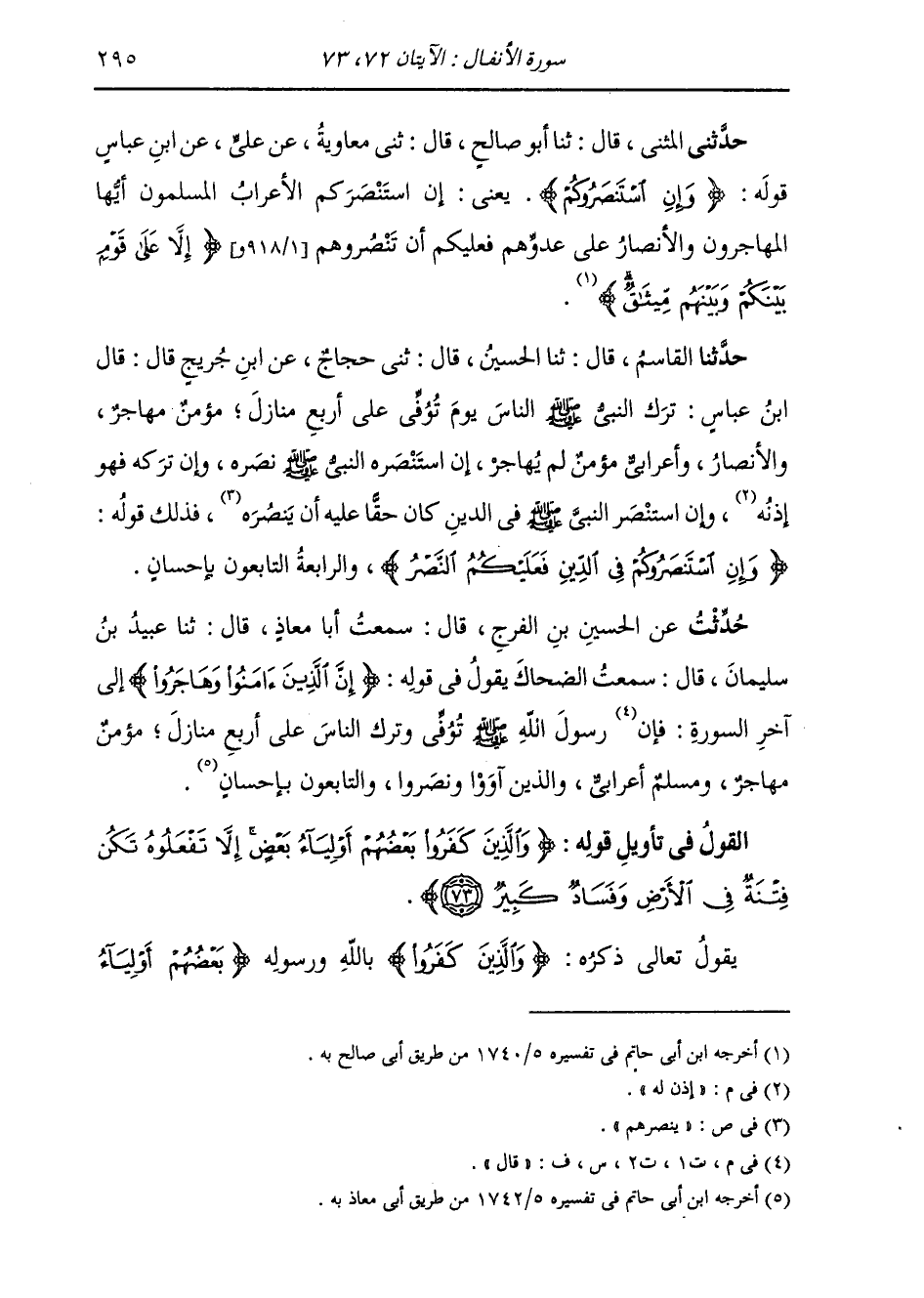 حَدَّثَنِي الْمُثَنَّى، قَالَ: ثنا أَبُو صَالِحٍ، قَالَ: ثني مُعَاوِيَةُ، عَنْ عَلِيٍّ، عَنِ ابْنِ عَبَّاسٍ، قَوْلُهُ: " {§وَإِنِ اسْتَنْصَرُوكُمْ فِي الدِّينِ} [الأنفال: 72] يَعْنِي: إِنِ اسْتَنْصَرَكُمُ الْأَعْرَابُ الْمُسْلِمُونَ أَيُّهَا الْمُهَاجِرُونَ وَالْأَنْصَارُ عَلَى عَدُوِّهِمْ فَعَلَيْكُمْ أَنْ تَنْصُرُوهُمْ {إِلَّا عَلَى قَوْمٍ بَيْنَكُمْ وَبَيْنَهُمْ مِيثَاقٌ} [الأنفال: 72] "