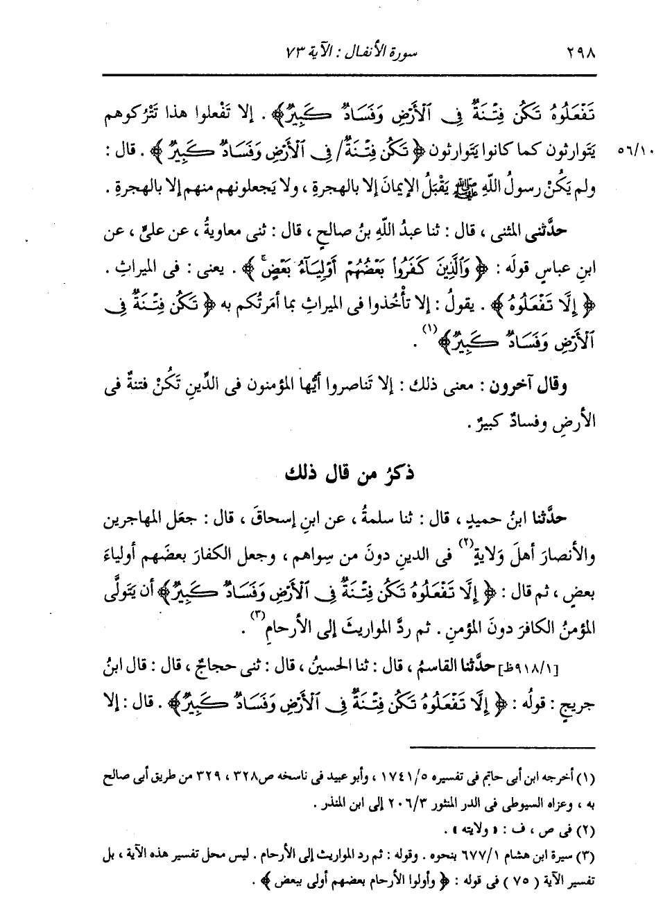 حَدَّثَنِي الْمُثَنَّى، قَالَ: ثنا عَبْدُ اللَّهِ بْنُ صَالِحٍ، قَالَ: ثني مُعَاوِيَةُ، عَنْ عَلِيٍّ، عَنِ ابْنِ عَبَّاسٍ، قَوْلُهُ: " {§وَالَّذِينَ كَفَرُوا بَعْضُهُمْ أَوْلِيَاءُ بَعْضٍ} [الأنفال: 73] يَعْنِي فِي الْمِيرَاثِ {إِلَّا تَفْعَلُوهُ} [الأنفال: 73] يَقُولُ: إِلَّا تَأْخُذُوا فِي الْمِيرَاثِ بِمَا أَمَرْتُكُمْ بِهِ {تَكُنْ فِتْنَةٌ فِي الْأَرْضِ وَفَسَادٌ كَبِيرٌ} [الأنفال: 73] " وَقَالَ آخَرُونَ: مَعْنَى ذَلِكَ: إِلَّا تَنَاصَرُوا أَيُّهَا الْمُؤْمِنُونَ فِي الدِّينِ تَكُنْ فِتْنَةٌ فِي الْأَرْضِ وَفَسَادٌ كَبِيرٌ