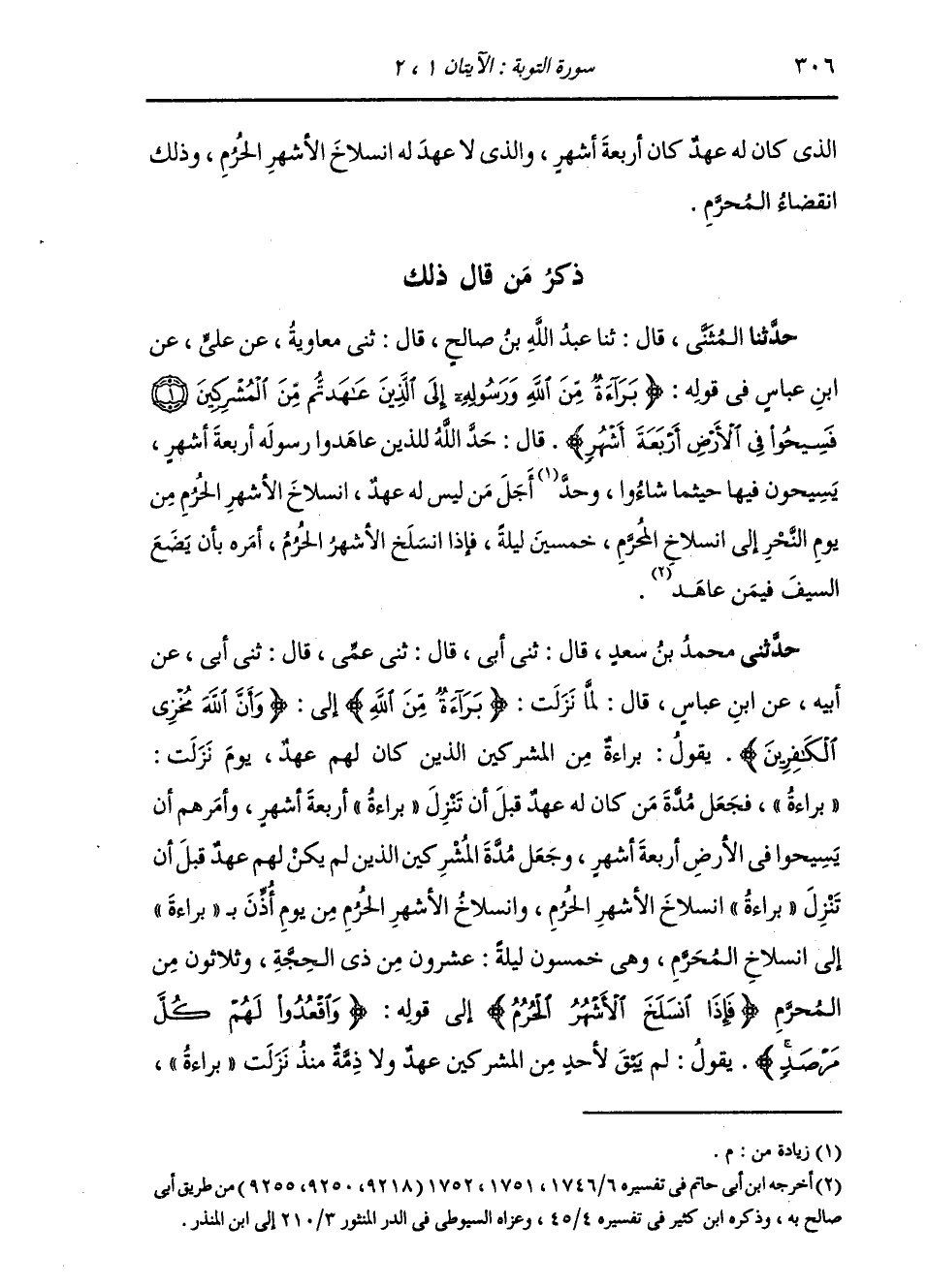 ذِكْرُ مَنْ قَالَ ذَلِكَ: حَدَّثَنَا الْمُثَنَّى، قَالَ: ثنا عَبْدُ اللَّهِ بْنُ صَالِحٍ، قَالَ: ثني مُعَاوِيَةُ، عَنْ عَلِيٍّ، عَنِ ابْنِ عَبَّاسٍ، فِي قَوْلِهِ: " {§بَرَاءَةٌ مِنَ اللَّهِ وَرَسُولِهِ إِلَى الَّذِينَ عَاهَدْتُمْ مِنَ الْمُشْرِكِينَ فَسِيحُوا فِي الْأَرْضِ أَرْبَعَةَ أَشْهُرٍ} [التوبة: 2] قَالَ: حَدَّ اللَّهُ لِلَّذِينَ عَاهَدُوا رَسُولَهُ أَرْبَعَةَ أَشْهُرٍ يَسِيحُونَ فِيهَا حَيْثُمَا شَاءُوا، وَحَدَّ أَجَلَ مَنْ لَيْسَ لَهُ عَهْدٌ انْسِلَاخَ الْأَشْهُرِ الْحُرُمِ مِنْ يَوْمِ النَّحْرِ إِلَى انْسِلَاخِ الْمُحَرَّمِ، فَذَلِكَ خَمْسُونَ لَيْلَةً، فَإِذَا انْسَلَخَ الْأَشْهُرُ الْحُرُمُ أَمَرَهُ بِأَنْ يَضَعَ السَّيْفَ فِيمَنْ عَاهَدَ "