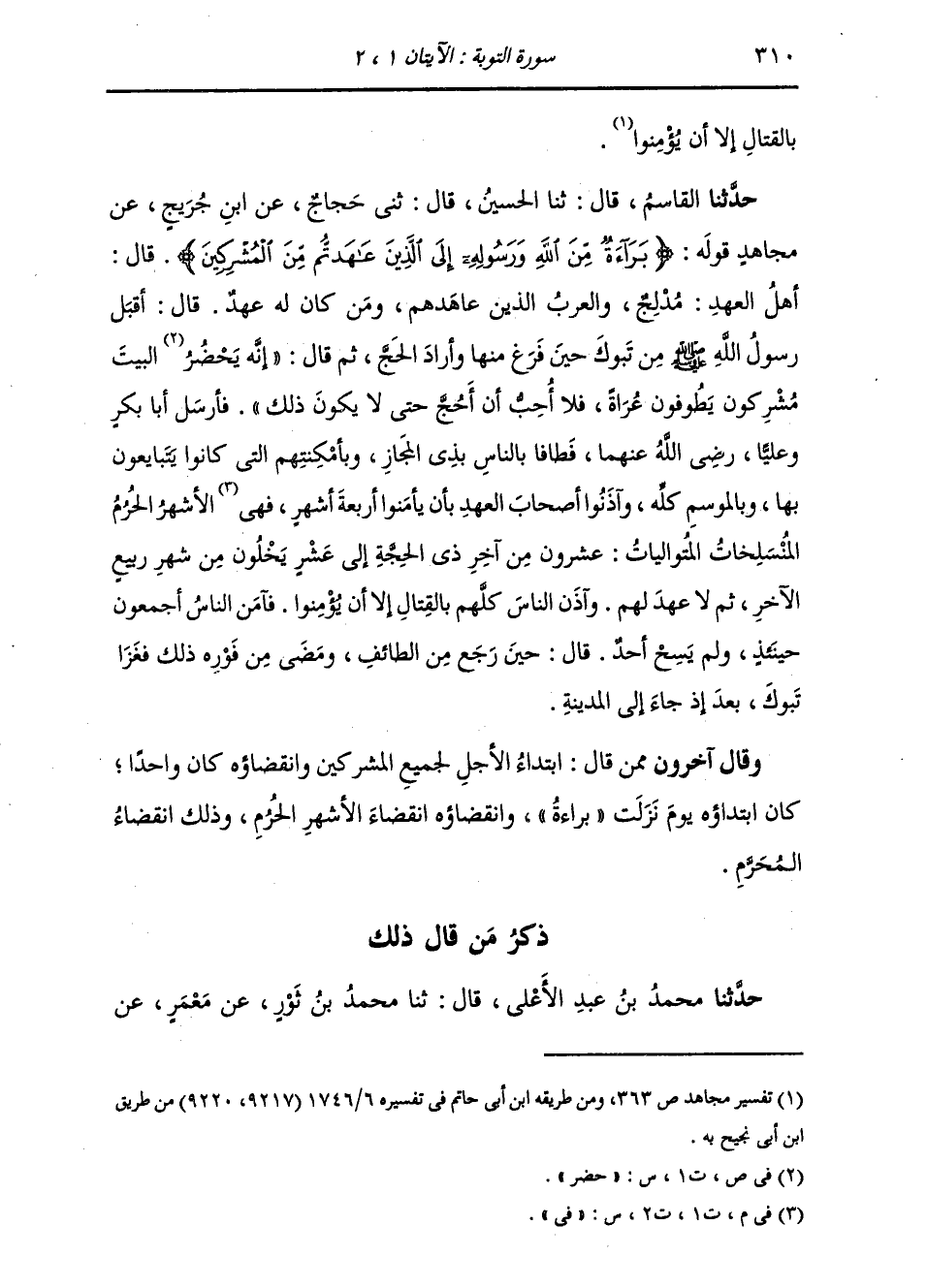 حَدَّثَنَا الْقَاسِمُ، قَالَ: ثنا الْحُسَيْنُ، قَالَ: ثني حَجَّاجٌ، عَنِ ابْنِ جُرَيْجٍ، عَنْ مُجَاهِدٍ، قَوْلُهُ: {§بَرَاءَةٌ مِنَ اللَّهِ وَرَسُولِهِ إِلَى الَّذِينَ عَاهَدْتُمْ مِنَ الْمُشْرِكِينَ} [التوبة: 1] قَالَ: أَهْلُ الْعَهْدِ مُدْلِجُ، وَالْعَرَبُ الَّذِينَ عَاهَدَهُمْ، وَمَنْ كَانَ لَهُ عَهْدٌ. قَالَ: أَقْبَلَ رَسُولُ اللَّهِ صَلَّى اللهُ عَلَيْهِ وَسَلَّمَ مِنْ تَبُوكَ حِينَ فَرَغَ مِنْهَا وَأَرَادَ الْحَجَّ، ثُمَّ قَالَ: «إِنَّهُ يَحْضُرُ الْبَيْتَ مُشْرِكُونَ يَطُوفُونَ عُرَاةً فَلَا أُحِبُّ أَنْ أَحُجَّ حَتَّى لَا يَكُونَ ذَلِكَ» فَأَرْسَلَ أَبَا بَكْرٍ وَعَلِيًّا رَضِيَ اللَّهُ عَنْهُمَا، فَطَافَا بِالنَّاسِ بِذِي الْمَجَازِ، وَبِأَمْكِنَتِهِمُ الَّتِي كَانُوا يَتَبَايَعُونَ بِهَا وَبِالْمَوْسِمِ كُلِّهِ، وَآذَنُوا أَصْحَابَ الْعَهْدِ بِأَنْ يَأْمَنُوا أَرْبَعَةَ أَشْهُرٍ، فِي الْأَشْهُرِ الْحُرُمِ الْمُنْسَلِخَاتِ الْمُتَوَالِيَاتِ: عِشْرُونَ مِنْ آخِرِ ذِي الْحِجَّةِ إِلَى عَشْرٍ يَخْلُونَ مِنْ شَهْرِ رَبِيعٍ الْآخَرِ، ثُمَّ لَا عَهْدَ لَهُمْ. وَآذَنَ النَّاسَ كُلَّهُمْ بِالْقِتَالِ إِلَّا أَنْ يُؤْمِنُوا، فَآمَنَ النَّاسُ أَجْمَعُونَ حِينَئِذٍ وَلَمْ يَسِحْ أَحَدٌ. وَقَالَ: حِينَ رَجَعَ مِنَ الطَّائِفِ مَضَى مِنْ فَوْرِهِ ذَلِكَ، فَغَزَا تَبُوكَ بَعْدَ إِذْ جَاءَ إِلَى الْمَدِينَةِ وَقَالَ آخَرُونَ مِمَّنْ قَالَ: ابْتِدَاءُ الْأَجَلِ لِجَمِيعِ الْمُشْرِكِينَ وَانْقِضَاؤُهُ كَانَ وَاحِدًا. كَانَ ابْتِدَاؤُهُ يَوْمَ نَزَلَتْ بَرَاءَةُ، وَانْقِضَاؤُهُ انْقِضَاءُ الْأَشْهُرِ الْحُرُمِ، وَذَلِكَ انْقِضَاءُ الْمُحَرَّمِ