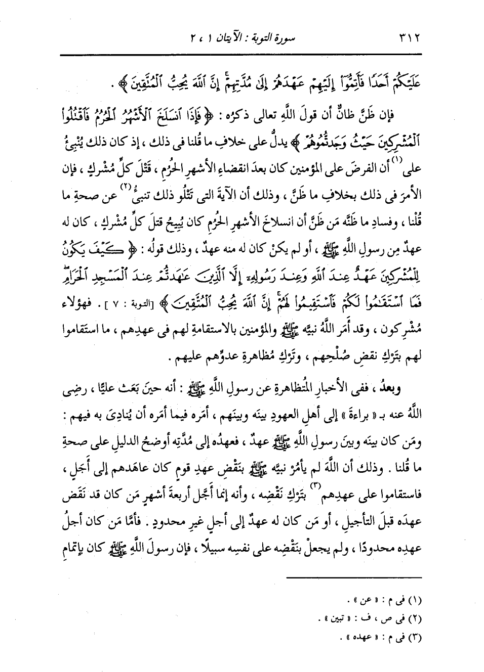 عَلَيْكُمْ أَحَدًا فَأَتِمُّوا إِلَيْهِمْ عَهْدَهُمْ إِلَى مُدَّتِهِمْ إِنَّ اللَّهَ يُحِبُّ الْمُتَّقِينَ} [التوبة: 4] فَإِنْ ظَنَّ ظَانٌّ أَنَّ قَوْلَ اللَّهِ تَعَالَى ذِكْرُهُ: {فَإِذَا انْسَلَخَ الْأَشْهُرُ الْحُرُمُ فَاقْتُلُوا الْمُشْرِكِينَ حَيْثُ وَجَدْتُمُوهُمْ} [التوبة: 5] يَدُلُّ عَلَى خِلَافِ مَا قُلْنَا فِي ذَلِكَ؛ إِذْ كَانَ ذَلِكَ يُنْبِئُ عَنْ أَنَّ الْفَرْضَ عَلَى الْمُؤْمِنِينَ كَانَ بَعْدَ انْقِضَاءِ الْأَشْهُرِ الْحُرُمِ قَتْلُ كُلِّ مُشْرِكٍ، فَإِنَّ الْأَمْرَ فِي ذَلِكَ بِخِلَافِ مَا ظَنَّ، وَذَلِكَ أَنَّ الْآيَةَ الَّتِي تَتْلُو ذَلِكَ تُنْبِئُ عَنْ صِحَّةِ مَا قُلْنَا وَفَسَادِ مَا ظَنَّهُ مَنْ ظَنَّ أَنَّ انْسِلَاخَ الْأَشْهُرِ الْحُرُمِ كَانَ يُبِيحُ قَتْلَ كُلِّ مُشْرِكٍ كَانَ لَهُ عَهْدٌ مِنْ رَسُولِ اللَّهِ صَلَّى اللهُ عَلَيْهِ وَسَلَّمَ أَوْ لَمْ يَكُنْ لَهُ مِنْهُ عَهْدٌ، وَذَلِكَ قَوْلُهُ: {كَيْفَ يَكُونُ لِلْمُشْرِكِينَ عَهْدٌ عِنْدَ اللَّهِ وَعِنْدَ رَسُولِهِ إِلَّا الَّذِينَ عَاهَدْتُمْ عِنْدَ الْمَسْجِدِ الْحَرَامِ فَمَا اسْتَقَامُوا لَكُمْ فَاسْتَقِيمُوا لَهُمْ إِنَّ اللَّهَ يُحِبُّ الْمُتَّقِينَ} [التوبة: 7] فَهَؤُلَاءِ مُشْرِكُونَ، وَقَدْ أَمَرَ اللَّهُ نَبِيَّهُ صَلَّى اللهُ عَلَيْهِ وَسَلَّمَ وَالْمُؤْمِنِينَ بِالِاسْتِقَامَةِ لَهُمْ فِي عَهْدِهِمْ مَا اسْتَقَامُوا لَهُمْ بِتَرْكِ نَقْضِ صُلْحِهِمْ وَتَرْكِ مُظَاهَرَةِ عَدُوِّهِمْ عَلَيْهِمْ. وَبَعْدُ: فَفِي الْأَخْبَارِ الْمُتَظَاهِرَةِ عَنْ رَسُولِ اللَّهِ صَلَّى اللهُ عَلَيْهِ وَسَلَّمَ أَنَّهُ حِينَ بَعَثَ عَلِيًّا رَضِيَ اللَّهُ عَنْهُ بِبَرَاءَةَ إِلَى أَهْلِ الْعُهُودِ بَيْنَهُ وَبَيْنَهُمْ أَمَرَهُ فِيمَا أَمَرَهُ أَنْ يُنَادِيَ بِهِ فِيهِمْ، وَمَنْ كَانَ بَيْنَهُ وَبَيْنَ رَسُولِ اللَّهِ صَلَّى اللهُ عَلَيْهِ وَسَلَّمَ عَهْدٌ، فَعَهْدُهُ إِلَى مُدَّتِهِ أَوْضَحُ الدَّلِيلِ عَلَى صِحَّةِ مَا قُلْنَا؛ وَذَلِكَ أَنَّ اللَّهَ لَمْ يَأْمُرْ نَبِيَّهُ صَلَّى اللهُ عَلَيْهِ وَسَلَّمَ بِنَقْضِ عَهْدِ قَوْمٍ كَانَ عَاهَدَهُمْ إِلَى أَجَلٍ، فَاسْتَقَامُوا عَلَى عَهْدِهِ بِتَرْكِ نَقْضِهِ، وَأَنَّهُ إِنَّمَا أَجَّلَ أَرْبَعَةَ أَشْهُرٍ مَنْ كَانَ قَدْ نَقْضَ عَهْدَهُ قَبْلَ التَّأْجِيلِ أَوْ مَنْ كَانَ لَهُ عَهْدٌ إِلَى أَجَلٍ غَيْرِ مَحْدُودٍ، فَأَمَّا مَنْ كَانَ أَجَلُ عَهْدِهِ مَحْدُودًا وَلَمْ يَجْعَلْ بِنِقْضِهِ عَلَى نَفْسِهِ سَبِيلًا، فَإِنَّ رَسُولَ اللَّهِ صَلَّى اللهُ عَلَيْهِ وَسَلَّمَ كَانَ بِإِتْمَامِ