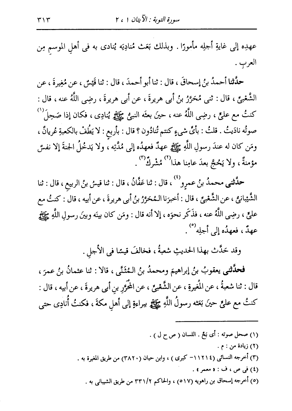 فَحَدَّثَنِي يَعْقُوبُ بْنُ إِبْرَاهِيمَ وَمُحَمَّدُ بْنُ الْمُثَنَّى، قَالَ: ثنا عُثْمَانُ بْنُ عُمَرَ، قَالَ: ثنا شُعْبَةُ، عَنِ الْمُغِيرَةِ، عَنِ الشَّعْبِيِّ، عَنِ الْمُحَرَّرِ بْنِ أَبِي هُرَيْرَةَ، عَنْ أَبِيهِ، قَالَ: " كُنْتُ مَعَ عَلِيٍّ حِينَ بَعَثَهُ رَسُولُ اللَّهِ صَلَّى اللهُ عَلَيْهِ وَسَلَّمَ بِبَرَاءَةَ إِلَى أَهْلِ مَكَّةَ، فَكُنْتُ أُنَادِي حَتَّى -[314]- صَحِلَ صَوْتِي، فَقُلْتُ: بِأَيِّ شَيْءٍ كُنْتَ تُنَادِي؟ قَالَ: §أَمَرَنَا أَنْ نُنَادِيَ أَنَّهُ لَا يَدْخُلُ الْجَنَّةَ إِلَّا مُؤْمِنٌ، وَمَنْ كَانَ بَيْنَهُ وَبَيْنَ رَسُولِ اللَّهِ صَلَّى اللهُ عَلَيْهِ وَسَلَّمَ عَهْدٌ فَأَجَلُهُ إِلَى أَرْبَعَةِ أَشْهُرٍ، فَإِذَا حَلَّ الْأَجَلُ فَإِنَّ اللَّهَ بَرِيءٌ مِنَ الْمُشْرِكِينَ وَرَسُولُهُ، وَلَا يَطُفْ بِالْبَيْتِ عُرْيَانٌ، وَلَا يَحُجُّ بَعْدَ الْعَامِ مُشْرِكٌ " قَالَ أَبُو جَعْفَرٍ رَحِمَهُ اللَّهُ: وَأَخْشَى أَنْ يَكُونَ هَذَا الْخَبَرُ وَهْمًا مِنْ نَاقِلِهِ فِي الْأَجَلِ؛ لِأَنَّ الْأَخْبَارَ مُتَظَاهِرَةٌ فِي الْأَجَلِ بِخِلَافِهِ مَعَ خِلَافِ قَيْسٍ شُعْبَةَ فِي نَفْسِ هَذَا الْحَدِيثِ عَلَى مَا بَيَّنْتُهُ