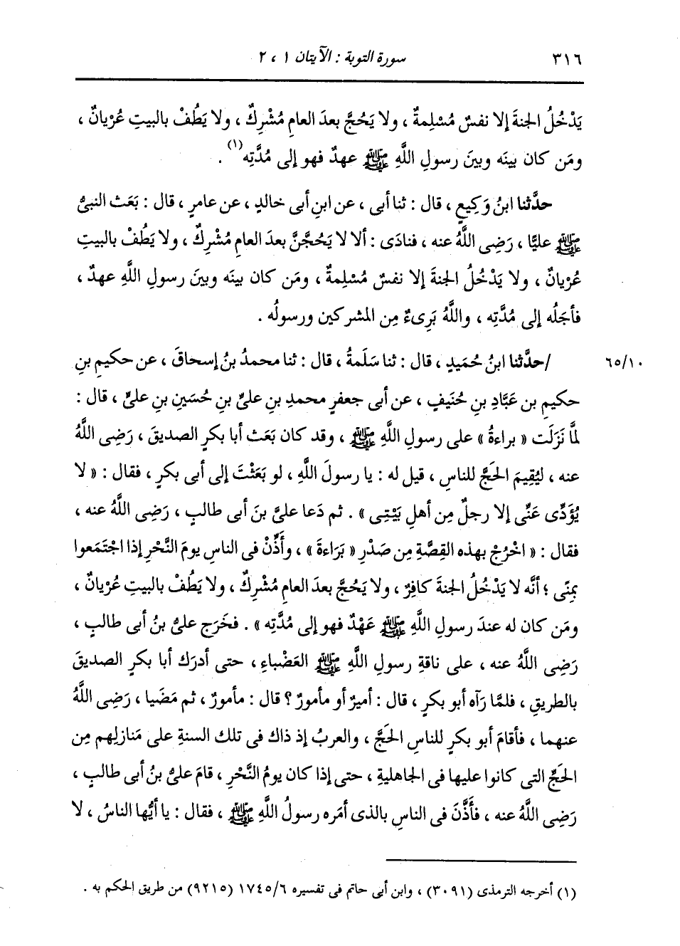 حَدَّثَنَا ابْنُ حُمَيْدٍ، قَالَ: ثنا سَلَمَةُ، قَالَ: ثنا مُحَمَّدُ بْنُ إِسْحَاقَ، عَنْ حَكِيمِ بْنِ حَكِيمِ بْنِ عَبَّادِ بْنِ حُنَيْفٍ، عَنْ أَبِي جَعْفَرٍ مُحَمَّدِ بْنِ عَلِيِّ بْنِ حُسَيْنِ بْنِ عَلِيٍّ، قَالَ: " §لَمَّا نَزَلَتْ بَرَاءَةُ عَلَى رَسُولِ اللَّهِ صَلَّى اللهُ عَلَيْهِ وَسَلَّمَ، وَقَدْ كَانَ بَعَثَ أَبَا بَكْرٍ الصِّدِّيقَ رَضِيَ اللَّهُ عَنْهُ لِيُقِيمَ الْحَجَّ لِلنَّاسِ، قِيلَ لَهُ: يَا رَسُولَ اللَّهِ لَوْ بَعَثْتَ إِلَى أَبِي بَكْرٍ فَقَالَ: «لَا يُؤَدِّي عَنِّي إِلَّا رَجُلٌ مِنْ أَهْلِ بَيْتِي» ثُمَّ دَعَا عَلِيَّ بْنَ أَبِي طَالِبٍ رَضِيَ اللَّهُ عَنْهُ فَقَالَ: " اخْرُجْ بِهَذِهِ الْقِصَّةِ مِنْ صَدْرِ بَرَاءَةَ، وَأَذِّنْ فِي النَّاسِ يَوْمَ النَّحْرِ إِذَا اجْتَمَعُوا بِمِنًى: أَنَّهُ لَا يَدْخُلُ الْجَنَّةَ كَافِرٌ، وَلَا يَحُجُّ بَعْدَ الْعَامِ مُشْرِكٌ، وَلَا يَطُوفُ بِالْبَيْتِ عُرْيَانٌ، وَمَنْ كَانَ لَهُ عِنْدَ رَسُولِ اللَّهِ صَلَّى اللهُ عَلَيْهِ وَسَلَّمَ عَهْدٌ فَهُوَ إِلَى مُدَّتِهِ " فَخَرَجَ عَلِيُّ بْنُ أَبِي طَالِبٍ رَضِيَ اللَّهُ عَنْهُ عَلَى نَاقَةِ رَسُولِ اللَّهِ صَلَّى اللهُ عَلَيْهِ وَسَلَّمَ الْعَضْبَاءِ، حَتَّى أَدْرَكَ أَبَا بَكْرٍ الصِّدِّيقَ بِالطَّرِيقِ، فَلَمَّا رَآهُ أَبُو بَكْرٍ، قَالَ: أَمِيرٌ أَوْ مَأْمُورٌ؟ قَالَ: مَأْمُورٌ. ثُمَّ مَضَيَا رَضِيَ اللَّهُ عَنْهُمَا، فَأَقَامَ أَبُو بَكْرٍ لِلنَّاسِ الْحَجَّ وَالْعَرَبُ إِذْ ذَاكَ فِي تِلْكَ السَّنَةِ عَلَى مَنَازِلِهِمْ مِنَ الْحَجِّ الَّتِي كَانُوا عَلَيْهَا فِي الْجَاهِلِيَّةِ، حَتَّى إِذَا كَانَ يَوْمُ النَّحْرِ، قَامَ عَلِيُّ بْنُ أَبِي طَالِبٍ رَضِيَ اللَّهُ عَنْهُ، فَأَذَّنَ فِي النَّاسِ بِالَّذِي أَمَرَهُ رَسُولُ اللَّهِ صَلَّى اللهُ عَلَيْهِ وَسَلَّمَ، فَقَالَ: يَا أَيُّهَا النَّاسُ لَا