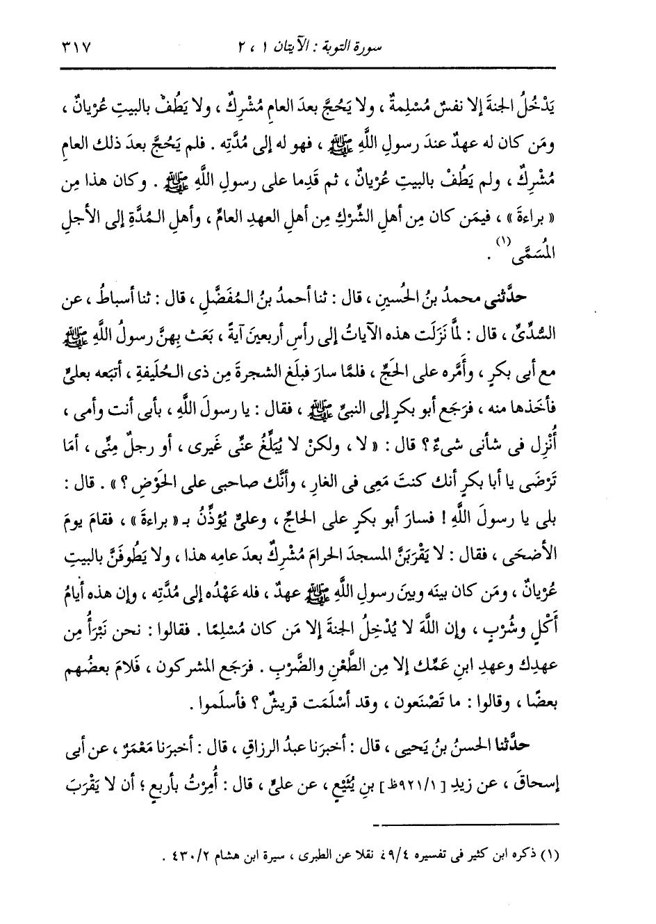 حَدَّثَنِي مُحَمَّدُ بْنُ الْحُسَيْنِ، قَالَ: ثنا أَحْمَدُ بْنُ الْمُفَضَّلِ، قَالَ: ثنا أَسْبَاطٌ، عَنِ السُّدِّيِّ، قَالَ: " §لَمَّا نَزَلَتْ هَذِهِ الْآيَاتُ إِلَى رَأْسِ أَرْبَعِينَ آيَةً، بَعَثَ بِهِنَّ رَسُولُ اللَّهِ صَلَّى اللهُ عَلَيْهِ وَسَلَّمَ مَعَ أَبِي بَكْرٍ وَأَمَّرَهُ عَلَى الْحَجِّ، فَلَمَّا سَارَ فَبَلَغَ الشَّجَرَةَ مِنْ ذِي الْحُلَيْفَةِ أَتْبَعَهُ بِعَلِيٍّ فَأَخَذَهَا مِنْهُ، فَرَجَعَ أَبُو بَكْرٍ إِلَى النَّبِيِّ صَلَّى اللهُ عَلَيْهِ وَسَلَّمَ، فَقَالَ: يَا رَسُولَ اللَّهِ بِأَبِي أَنْتَ وَأُمِّي أَنَزَلَ فِي شَأْنِي شَيْءٌ؟ قَالَ: «لَا، وَلَكِنْ لَا يُبَلِّغُ عَنِّي غَيْرِي أَوْ رَجُلٌ مِنِّي أَمَا تَرْضَى يَا أَبَا بَكْرِ أَنَّكَ كُنْتَ مَعِي فِي الْغَارِ، وَأَنَّكَ صَاحِبِي عَلَى الْحَوْضِ؟» قَالَ: بَلَى يَا رَسُولَ اللَّهِ فَسَارَ أَبُو بَكْرٍ عَلَى الْحَاجِّ، وَعَلِيٌّ يُؤَذِّنُ بِبَرَاءَةَ، فَقَامَ يَوْمَ الْأَضْحَى، فَقَالَ: لَا يَقْرَبَنَّ الْمَسْجِدَ الْحَرَامَ مُشْرِكٌ بَعْدَ عَامِهِ هَذَا، وَلَا يَطُوفَنَّ بِالْبَيْتِ عُرْيَانٌ، وَمَنْ كَانَ بَيْنَهُ وَبَيْنَ رَسُولِ اللَّهِ صَلَّى اللهُ عَلَيْهِ وَسَلَّمَ عَهْدٌ فَلَهُ عَهْدُهُ إِلَى مُدَّتِهِ، وَإِنَّ هَذِهِ أَيَّامُ أَكْلٍ وَشُرْبٍ، وَإِنَّ اللَّهَ لَا يُدْخِلُ الْجَنَّةَ إِلَّا مَنْ كَانَ مُسْلِمًا. فَقَالُوا: نَحْنُ نَبْرَأُ مِنْ عَهْدِكَ وَعَهْدِ ابْنِ عَمِّكَ إِلَّا مِنَ الطَّعْنِ وَالضَّرْبِ، فَرَجَعَ الْمُشْرِكُونَ فَلَامَ بَعْضُهُمْ بَعْضًا، وَقَالُوا: مَا تَصْنَعُونَ وَقَدْ أَسْلَمَتْ قُرَيْشٌ؟ فَأَسْلَمُوا "
