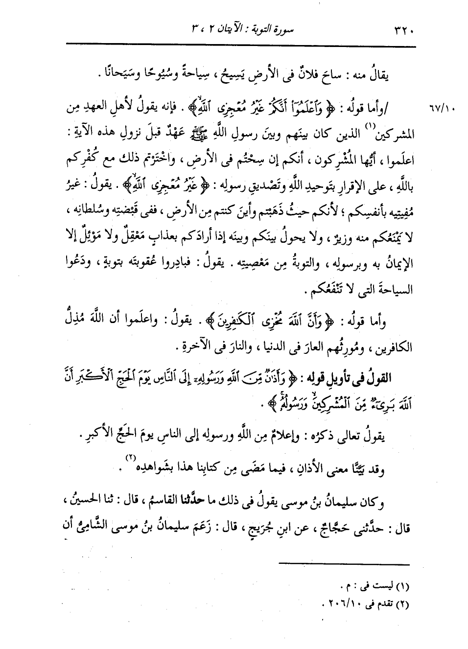 §الْقَوْلُ فِي تَأْوِيلِ قَوْلِهِ تَعَالَى: {وَأَذَانٌ مِنَ اللَّهِ وَرَسُولِهِ إِلَى النَّاسِ يَوْمَ الْحَجِّ الْأَكْبَرِ أَنَّ اللَّهَ بَرِيءٌ مِنَ الْمُشْرِكِينَ وَرَسُولُهُ فَإِنْ تُبْتُمْ فَهُوَ خَيْرٌ لَّكُمْ وَإِنْ تَوَلَّيْتُمْ فَاعْلَمُوا أَنَّكُمْ غَيْرُ مُعْجِزِي اللَّهِ وَبَشِّرِ الَّذِينَ كَفَرُوا بِعَذَابٍ أَلِيمٍ} [التوبة: 3] يَقُولُ تَعَالَى ذِكْرُهُ: وَإِعْلَامٌ مِنَ اللَّهِ وَرَسُولِهِ إِلَى النَّاسِ يَوْمَ الْحَجِّ الْأَكْبَرِ. وَقَدْ بَيَّنَّا مَعْنَى الْأَذَانِ فِيمَا مَضَى مِنْ كِتَابِنَا هَذَا بِشَوَاهِدِهِ