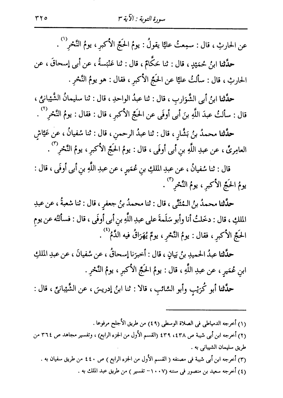 حَدَّثَنَا أَبُو كُرَيْبٍ وَأَبُو السَّائِبِ، قَالَا: ثنا ابْنُ إِدْرِيسَ، عَنِ الشَّيْبَانِيِّ، قَالَ: -[326]- سَأَلْتُ ابْنَ أَبِي أَوْفَى عَنْ §يَوْمِ الْحَجِّ الْأَكْبَرِ؟ قَالَ: «يَوْمُ النَّحْرِ»