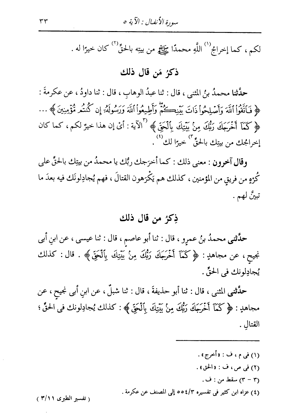 ذِكْرُ مَنْ قَالَ ذَلِكَ: حَدَّثَنَا مُحَمَّدُ بْنُ الْمُثَنَّى، قَالَ: ثنا عَبْدُ الْوَهَّابِ، قَالَ: ثنا دَاوُدُ، عَنْ عِكْرِمَةَ: " {§فَاتَّقُوا اللَّهَ وَأَصْلِحُوا ذَاتَ بَيْنِكُمْ وَأَطِيعُوا اللَّهَ وَرَسُولَهُ إِنْ كُنْتُمْ مُؤْمِنِينَ} [الأنفال: 1] , {كَمَا أَخْرَجَكَ رَبُّكَ مِنْ بَيْتِكِ بِالْحَقِّ} [الأنفال: 5] الْآيَةَ: أَيْ: إِنَّ هَذَا خَيْرٌ لَكُمْ، كَمَا كَانَ إِخْرَاجُكَ مِنْ بَيْتِكِ بِالْحَقِّ خَيْرًا لَكَ " وَقَالَ آخَرُونَ: مَعْنَى ذَلِكَ: كَمَا أَخْرَجَكَ رَبُّكَ يَا مُحَمَّدُ مِنْ بَيْتِكِ بِالْحَقِّ عَلَى كُرْهٍ مِنْ فَرِيقٍ مِنَ الْمُؤْمِنِينَ كَذَلِكَ هُمْ يَكْرَهُونَ الْقِتَالَ، فَهُمْ يُجَادِلُونَكَ فِيهِ بَعْدَ مَا تَبَيَّنَ لَهُمْ