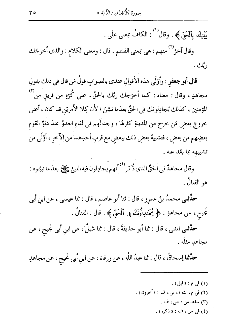 حَدَّثَنِي مُحَمَّدُ بْنُ عَمْرٍو، قَالَ: ثنا أَبُو عَاصِمٍ، قَالَ: ثنا عِيسَى، عَنِ ابْنِ أَبِي نَجِيحٍ، عَنْ مُجَاهِدٍ: " {§يُجَادِلُونَكَ فِي الْحَقِّ} [الأنفال: 6] قَالَ: الْقِتَالُ ". حَدَّثَنِي الْمُثَنَّى، قَالَ: ثنا أَبُو حُذَيْفَةَ، قَالَ: ثنا شِبْلٌ، عَنِ ابْنِ أَبِي نَجِيحٍ، عَنْ مُجَاهِدٍ، مِثْلَهُ حَدَّثَنَا إِسْحَاقُ، قَالَ: ثنا عَبْدُ اللَّهِ، عَنْ وَرْقَاءَ، عَنِ ابْنِ أَبِي نَجِيحٍ، عَنْ مُجَاهِدٍ، -[36]- مِثْلَهُ