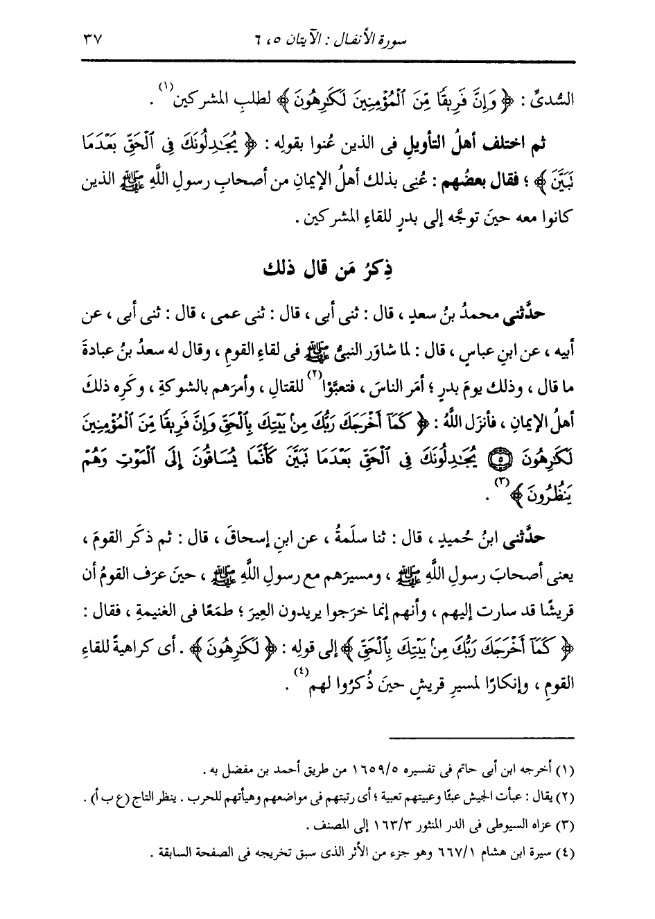 ذِكْرُ مَنْ قَالَ ذَلِكَ: حَدَّثَنِي مُحَمَّدُ بْنُ سَعْدٍ، قَالَ: ثني أَبِي، قَالَ: ثني عَمِّي، قَالَ: ثني أَبِي، عَنْ أَبِيهِ، عَنِ ابْنِ عَبَّاسٍ، قَالَ: " §لَمَّا شَاوَرَ النَّبِيُّ صَلَّى اللهُ عَلَيْهِ وَسَلَّمَ فِي لِقَاءِ الْقَوْمِ، وَقَالَ لَهُ سَعْدُ بْنُ عُبَادَةَ مَا قَالَ: وَذَلِكَ يَوْمَ بَدْرٍ، أَمَرَ النَّاسَ، فَتَعَبَّئُوا لِلْقِتَالِ، وَأَمَرَهُمْ بِالشَّوْكَةِ، وَكَرِهَ ذَلِكَ أَهْلُ الْإِيمَانِ، فَأَنْزَلَ اللَّهُ: {كَمَا أَخْرَجَكَ رَبُّكَ مِنْ بَيْتِكَ بِالْحَقِّ وَإِنَّ فَرِيقًا مِنَ الْمُؤْمِنِينَ لَكَارِهُونَ يُجَادِلُونَكَ فِي الْحَقِّ بَعْدَ مَا تَبَيَّنَ كَأَنَّمَا يُسَاقُونَ إِلَى الْمَوْتِ وَهُمْ يَنْظُرُونَ} "
