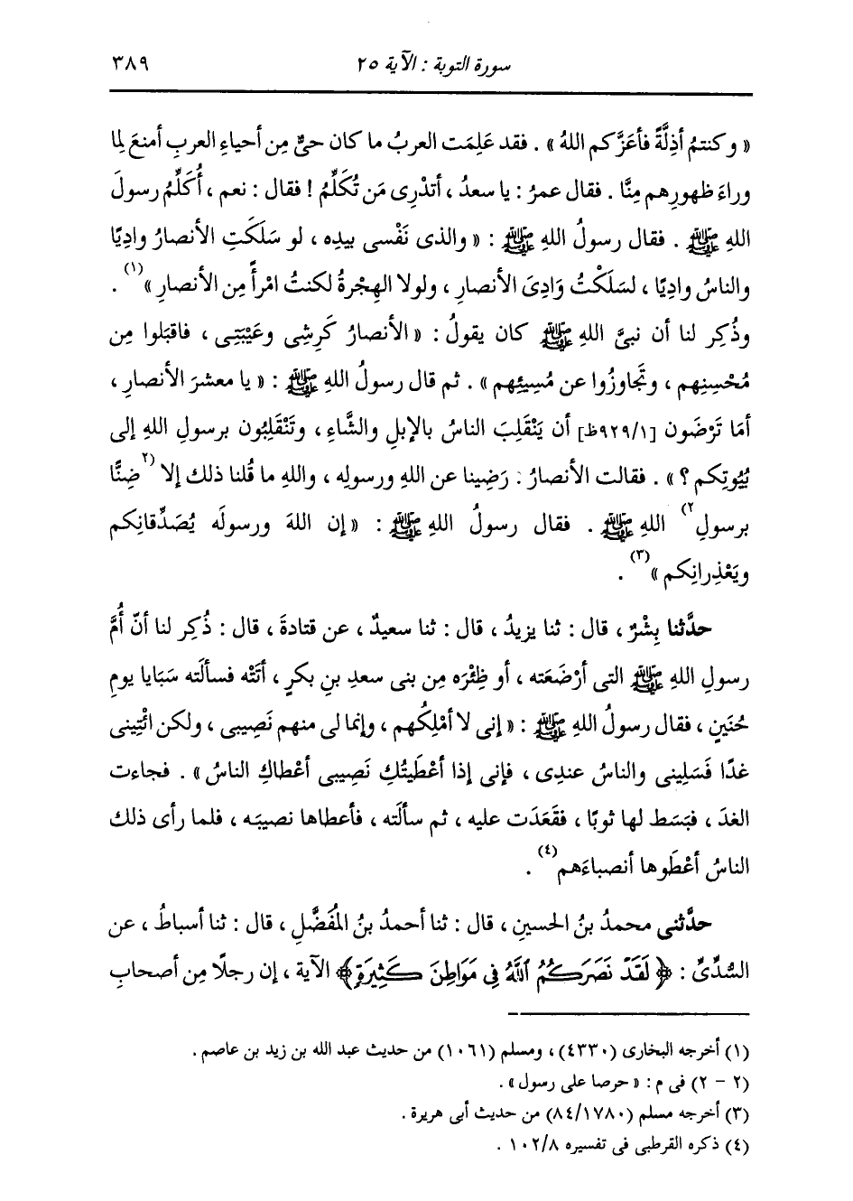 حَدَّثَنِي مُحَمَّدُ بْنُ الْحُسَيْنِ، قَالَ: ثنا أَحْمَدُ بْنُ الْمُفَضَّلِ، قَالَ: ثنا أَسْبَاطٌ، عَنِ السُّدِّيِّ: {§لَقَدْ نَصَرَكُمُ اللَّهُ فِي مَوَاطِنَ كَثِيرَةٍ} [التوبة: 25] الْآيَةَ: إِنَّ رَجُلًا مِنْ أَصْحَابِ -[390]- رَسُولِ اللَّهِ صَلَّى اللهُ عَلَيْهِ وَسَلَّمَ يَوْمَ حُنَيْنٍ قَالَ: يَا رَسُولَ اللَّهِ لَنْ نُغْلَبَ الْيَوْمَ مِنْ قِلَّةٍ، وَأَعْجَبَتْهُ كَثْرَةُ النَّاسِ، وَكَانُوا اثْنَيْ عَشَرَ أَلْفًا. فَسَارَ رَسُولُ اللَّهِ صَلَّى اللهُ عَلَيْهِ وَسَلَّمَ، فَوُكِّلُوا إِلَى كَلِمَةِ الرَّجُلِ، فَانْهَزَمُوا عَنْ رَسُولِ اللَّهِ صَلَّى اللهُ عَلَيْهِ وَسَلَّمَ، غَيْرَ الْعَبَّاسِ وَأَبِي سُفْيَانَ بْنِ الْحَارِثِ وَأَيْمَنَ ابْنِ أُمِّ أَيْمَنَ، قُتِلَ يَوْمَئِذٍ بَيْنَ يَدَيْهِ. فَنَادَى رَسُولُ اللَّهِ صَلَّى اللهُ عَلَيْهِ وَسَلَّمَ: «أَيْنَ الْأَنْصَارُ؟ أَيْنَ الَّذِينَ بَايَعُوا تَحْتَ الشَّجَرَةِ؟» فَتَرَاجَعَ النَّاسُ، فَأَنْزَلَ اللَّهُ الْمَلَائِكَةَ بِالنَّصْرِ، فَهَزَمُوا الْمُشْرِكِينَ يَوْمَئِذٍ، وَذَلِكَ قَوْلُهُ: {ثُمَّ أَنْزَلَ اللَّهُ سَكِينَتَهُ عَلَى رَسُولِهِ وَعَلَى الْمُؤْمِنِينَ وَأَنْزَلَ جُنُودًا لَمْ تَرَوْهَا} [التوبة: 26] الْآيَةَ