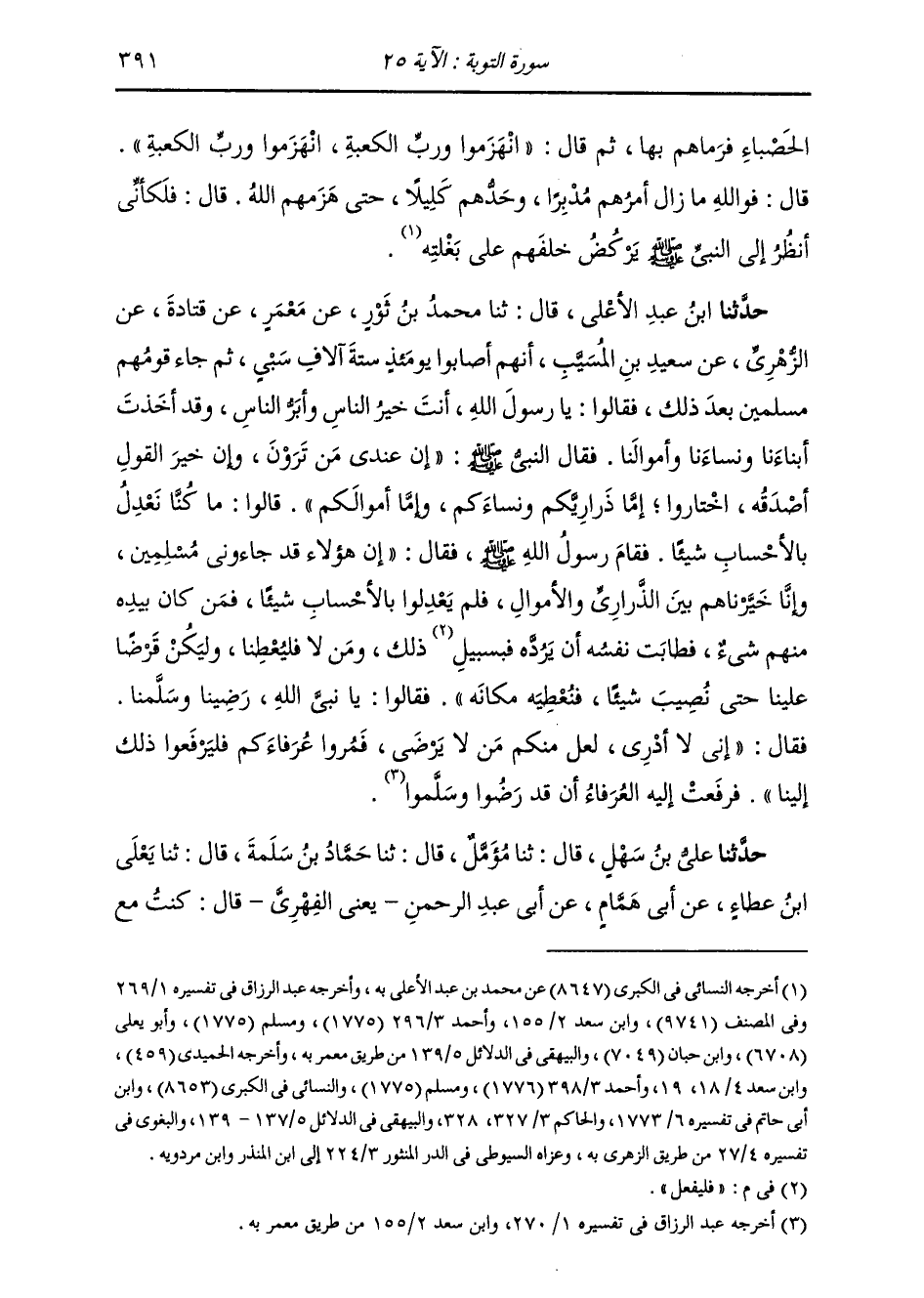 حَدَّثَنَا ابْنُ عَبْدِ الْأَعْلَى، قَالَ: ثنا مُحَمَّدُ بْنُ ثَوْرٍ، عَنْ مَعْمَرٍ، عَنْ قَتَادَةَ، عَنِ الزُّهْرِيِّ، عَنْ سَعِيدِ بْنِ الْمُسَيِّبِ، أَنَّهُمْ أَصَابُوا يَوْمَئِذٍ سِتَّةَ آلَافِ سَبْيٍ، ثُمَّ جَاءَ قَوْمُهُمْ مُسْلِمِينَ بَعْدَ ذَلِكَ، فَقَالُوا: يَا رَسُولَ اللَّهِ، أَنْتَ خَيْرُ النَّاسِ، وَأَبَرُّ النَّاسِ، وَقَدْ أَخَذْتَ أَبْنَاءَنَا وَنِسَاءَنَا وَأَمْوَالَنَا. فَقَالَ النَّبِيُّ صَلَّى اللهُ عَلَيْهِ وَسَلَّمَ: «إِنَّ §عِنْدِي مَنْ تَرَوْنَ، وَإِنَّ خَيْرَ الْقَوْلِ أَصْدَقُهُ، اخْتَارُوا إِمَّا ذَرَارِيَّكُمْ وَنِسَاءَكُمْ وَإِمَّا أَمْوَالَكُمْ» قَالُوا: مَا كُنَّا نَعْدِلُ بِالْأَحْسَابِ شَيْئًا. فَقَامَ رَسُولُ اللَّهِ صَلَّى اللهُ عَلَيْهِ وَسَلَّمَ، فَقَالَ: «إِنَّ هَؤُلَاءِ قَدْ جَاءُونِي مُسْلِمِينَ، وَإِنَّا خَيَّرْنَاهُمْ بَيْنَ الذَّرَارِيِّ وَالْأَمْوَالِ فَلَمْ يَعْدِلُوا بِالْأَحْسَابِ شَيْئًا، فَمَنْ كَانَ بِيَدِهِ مِنْهُمْ شَيْءٌ فَطَابَتْ نَفْسُهُ أَنْ يَرُدَّهُ فَلْيَفْعَلْ ذَلِكَ، وَمَنْ لَا فَلْيُعْطِنَا، وَلْيَكُنْ قَرْضًا عَلَيْنَا حَتَّى نُصِيبَ شَيْئًا فَنُعْطِيَهُ مَكَانَهُ» فَقَالُوا: يَا نَبِيَّ اللَّهِ رَضِينَا وَسَلَّمْنَا. فَقَالَ: «إِنِّي لَا أَدْرِي، لَعَلَّ مِنْكُمْ مَنْ لَا يَرْضَى، فَمُرُوا عُرَفَاءَكُمْ فَلْيَرْفَعُوا ذَلِكَ إِلَيْنَا» فَرَفَعَتْ إِلَيْهِ الْعُرَفَاءُ أَنْ قَدْ رَضُوا وَسَلَّمُوا
