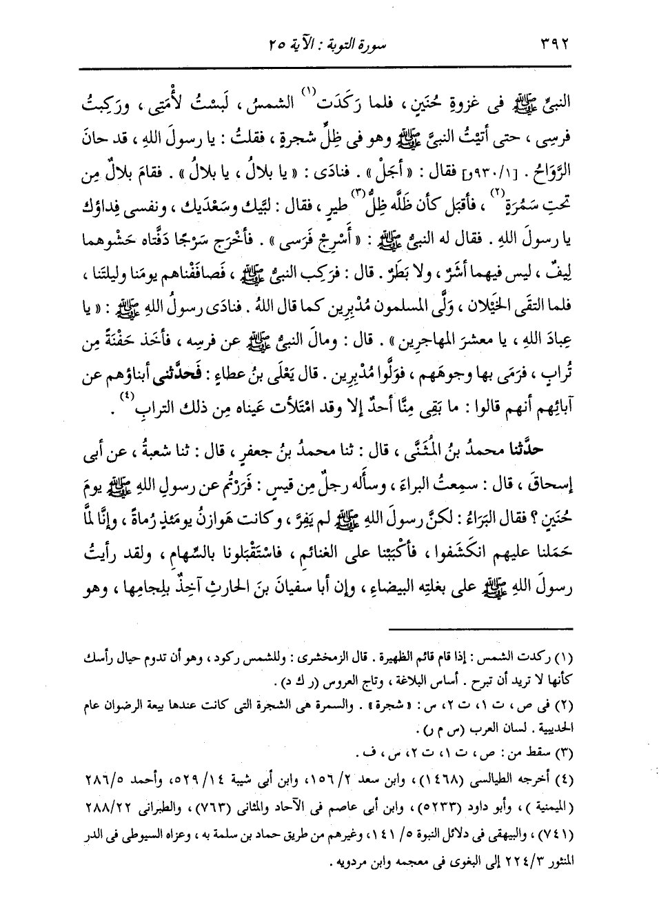 حَدَّثَنَا مُحَمَّدُ بْنُ الْمُثَنَّى، قَالَ: ثنا مُحَمَّدُ بْنُ جَعْفَرٍ، قَالَ: ثنا شُعْبَةُ، عَنْ أَبِي إِسْحَاقَ، قَالَ: سَمِعْتُ الْبَرَاءَ، وَسَأَلَهُ رَجُلٌ مِنْ قَيْسٍ: فَرَرْتُمْ عَنْ رَسُولِ اللَّهِ صَلَّى اللهُ عَلَيْهِ وَسَلَّمَ يَوْمَ حُنَيْنٍ؟ فَقَالَ الْبَرَاءُ: «§لَكِنْ رَسُولُ اللَّهِ صَلَّى اللَّهُ عَلَيْهِ وَسَلَّم لَمْ يَفِرَّ، وَكَانَتْ هَوَازِنُ يَوْمَئِذٍ رُمَاةً، وَإِنَّا لَمَّا حَمَلْنَا عَلَيْهِمُ انْكَشَفُوا فَأَكْبَبْنَا عَلَى الْغَنَائِمِ فَاسْتَقْبَلُونَا بِالسِّهَامِ، وَلَقَدْ رَأَيْتُ رَسُولَ اللَّهِ صَلَّى اللهُ عَلَيْهِ وَسَلَّمَ عَلَى بَغْلَتِهِ الْبَيْضَاءِ وَإِنَّ أَبَا سُفْيَانَ بْنَ الْحَارِثِ آخِذٌ بِلِجَامِهَا، وَهُوَ -[393]- يَقُولُ» أَنَا النَّبِيُّ لَا كَذِبْ أَنَا ابْنُ عَبْدِ الْمُطَّلِبْ "