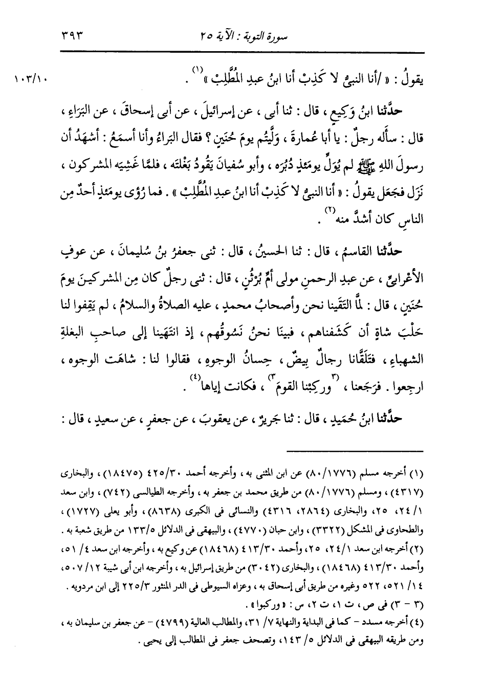 حَدَّثَنَا ابْنُ وَكِيعٍ، قَالَ: ثنا أَبِي، عَنْ إِسْرَائِيلَ، عَنْ أَبِي إِسْحَاقَ، عَنِ الْبَرَاءِ، قَالَ: سَأَلَهُ رَجُلٌ: يَا أَبَا عُمَارَةَ، وَلَّيْتُمَّ يَوْمَ حُنَيْنٍ؟ فَقَالَ الْبَرَاءُ وَأَنَا أَسْمَعُ: أَشْهَدُ أَنَّ رَسُولَ اللَّهِ لَمْ يُوَلِّ يَوْمَئِذٍ دُبُرَهُ، وَأَبُو سُفْيَانَ يَقُودُ بَغْلَتَهُ، فَلَمَّا غَشِيَهُ الْمُشْرِكُونَ نَزَلَ فَجَعَلَ يَقُولُ: «§أَنَا النَّبِيُّ لَا كَذِبْ أَنَا ابْنُ عَبْدِ الْمُطَّلِبْ» فَمَا رُئِيَ يَوْمَئِذٍ أَحَدٌ مِنَ النَّاسِ كَانَ أَشَدَّ مِنْهُ