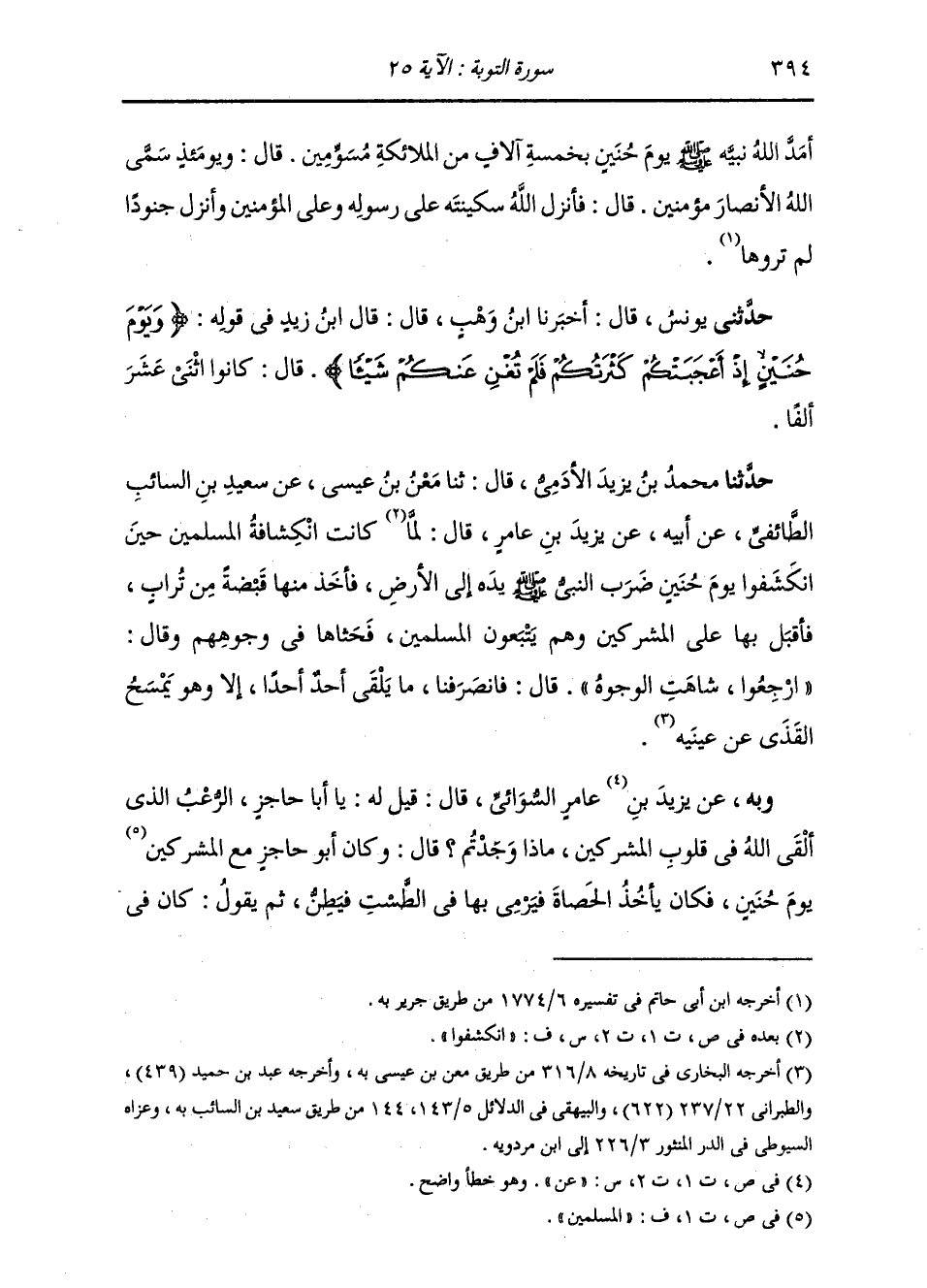 حَدَّثَنَا مُحَمَّدُ بْنُ يَزِيدَ الْآدَمَيُّ، قَالَ: ثنا مَعْنُ بْنُ عِيسَى، عَنْ سَعِيدِ بْنِ السَّائِبِ الطَّائِفِيِّ، عَنْ أَبِيهِ، عَنْ يَزِيدَ بْنِ عَامِرٍ، قَالَ: لَمَّا كَانَتِ انْكِشَافَةُ الْمُسْلِمِينَ حِينَ انْكَشَفُوا يَوْمَ حُنَيْنٍ، ضَرَبَ النَّبِيُّ صَلَّى اللهُ عَلَيْهِ وَسَلَّمَ يَدَهُ إِلَى الْأَرْضِ، فَأَخَذَ مِنْهَا قَبْضَةً مِنْ تُرَابٍ، فَأَقْبَلَ بِهَا عَلَى الْمُشْرِكِينَ وَهُمْ يَتَّبِعُونَ الْمُسْلِمِينَ، فَحَثَاهَا فِي وُجُوهِمْ وَقَالَ: «§ارْجِعُوا شَاهَتِ الْوُجُوهُ» قَالَ: فَانْصَرَفْنَا مَا يَلْقَى أَحَدٌ أَحَدًا إِلَّا وَهُوَ يَمْسَحُ الْقَذَى عَنْ عَيْنَيْهِ