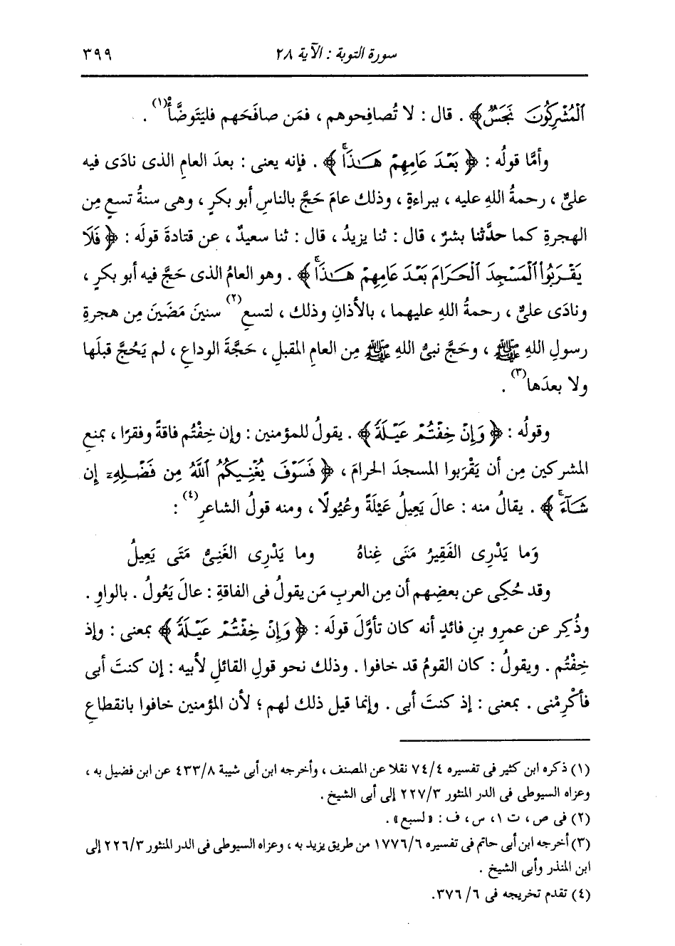 §وَأَمَّا قَوْلُهُ: {بَعْدَ عَامِهِمْ هَذَا} [التوبة: 28] فَإِنَّهُ يَعْنِي: بَعْدَ الْعَامِ الَّذِي نَادَى فِيهِ عَلِيُّ رَحْمَةُ اللَّهِ عَلَيْهِ بِبَرَاءَةَ، وَذَلِكَ عَامَ حَجَّ بِالنَّاسِ أَبُو بَكْرٍ، وَهِيَ سَنَةُ تِسْعٍ مِنَ الْهِجْرَةِ