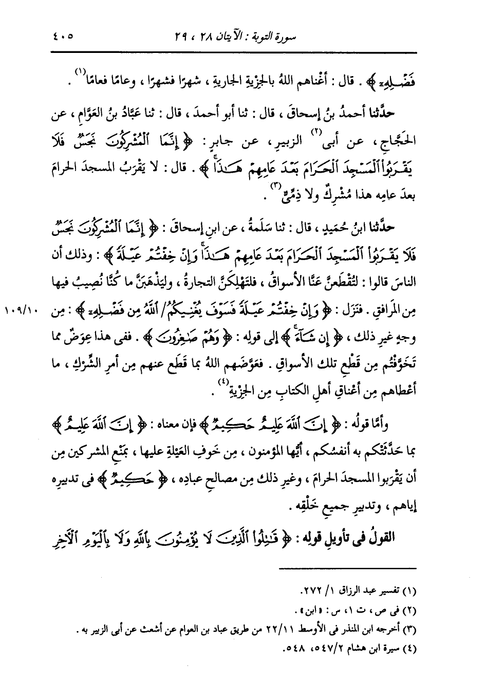 حَدَّثَنَا ابْنُ حُمَيْدٍ، قَالَ: ثنا سَلَمَةُ، عَنِ ابْنِ إِسْحَاقَ: " {§إِنَّمَا الْمُشْرِكُونَ نَجَسٌ فَلَا يَقْرَبُوا الْمَسْجِدَ الْحَرَامَ بَعْدَ عَامِهِمْ هَذَا وَإِنْ خِفْتُمْ عَيْلَةً} [التوبة: 28] وَذَلِكَ أَنَّ النَّاسَ قَالُوا: لَتُقْطَعَنَّ عَنَّا الْأَسْوَاقُ وَلَتَهْلِكَنَّ التِّجَارَةُ وَلَيَذْهَبَنَّ مَا كُنَّا نُصِيبُ فِيهَا مِنَ الْمَرَافِقِ، فَنَزَلَ: {وَإِنْ خِفْتُمْ عَيْلَةً فَسَوْفَ يُغْنِيكُمُ اللَّهُ مِنْ فَضْلِهِ} [التوبة: 28] مِنْ وَجْهٍ غَيْرِ ذَلِكَ {إِنْ شَاءَ} [البقرة: 70] إِلَى قَوْلِهِ: {وَهُمْ صَاغِرُونَ} [التوبة: 29] فَفِي هَذَا عِوَضٌ مِمَّا تَخَوَّفْتُمْ مِنْ قَطْعِ تِلْكَ الْأَسْوَاقِ. فَعَوَّضَهُمُ اللَّهُ بِمَا قُطِعَ عَنْهُمْ مِنْ أَمْرِ الشِّرْكِ مَا أَعْطَاهُمْ مِنْ أَعْنَاقِ أَهْلِ الْكِتَابِ مِنَ الْجِزْيَةِ "
