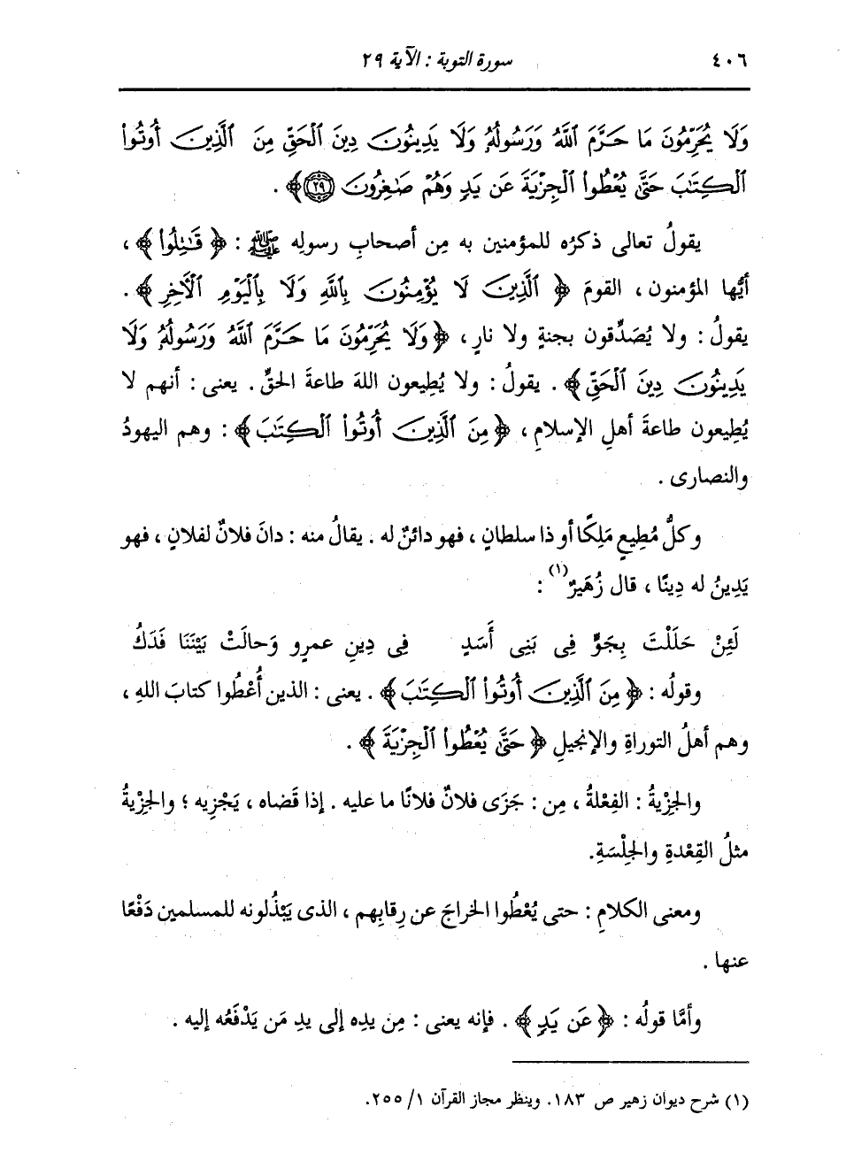 وَلَا يُحَرِّمُونَ مَا حَرَّمَ اللَّهُ وَرَسُولُهُ وَلَا يَدِينُونَ دِينَ الْحَقِّ مِنَ الَّذِينَ أُوتُوا الْكِتَابَ حَتَّى يُعْطُوا الْجِزْيَةَ عَنْ يَدٍ وَهُمْ صَاغِرُونَ} [التوبة: 29] يَقُولُ تَعَالَى ذِكْرُهُ لِلْمُؤْمِنِينَ بِهِ مِنْ أَصْحَابِ رَسُولِهِ صَلَّى اللهُ عَلَيْهِ وَسَلَّمَ: {قَاتِلُوا} [آل عمران: 167] أَيُّهَا الْمُؤْمِنُونَ الْقَوْمَ {الَّذِينَ لَا يُؤْمِنُونَ بِاللَّهِ وَلَا بِالْيَوْمِ الْآخِرِ} [التوبة: 29] يَقُولُ: وَلَا يُصَدِّقُونَ بِجَنَّةٍ وَلَا نَارٍ. {وَلَا يُحَرِّمُونَ مَا حَرَّمَ اللَّهُ وَرَسُولُهُ وَلَا يَدِينُونَ دِينَ الْحَقِّ} [التوبة: 29] يَقُولُ: وَلَا يُطِيعُونَ اللَّهَ طَاعَةَ الْحَقِّ. يَعْنِي: أَنَّهُمْ لَا يُطِيعُونَ طَاعَةَ أَهْلِ الْإِسْلَامِ. {مِنَ الَّذِينَ أُوتُوا الْكِتَابَ} [البقرة: 101] وَهُمُ الْيَهُودُ وَالنَّصَارَى، وَكُلُّ مُطِيعٍ مَلِكًا أَوْ ذَا سُلْطَانٍ، فَهُوَ دَائِنٌ لَهُ، يُقَالُ مِنْهُ: دَانَ فُلَانٌ لِفُلَانٍ فَهُوَ يَدِينُ لَهُ دِينًا، قَالَ زُهَيْرٌ: