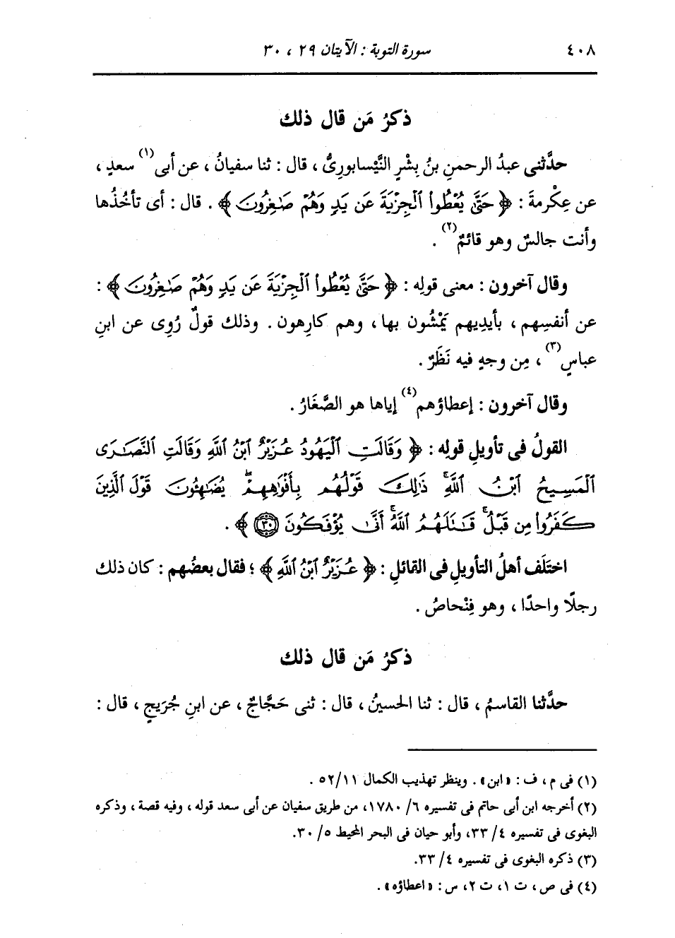 ذِكْرُ مَنْ قَالَ ذَلِكَ: حَدَّثَنِي عَبْدُ الرَّحْمَنِ بْنُ بِشْرٍ النَّيْسَابُورِيُّ، قَالَ: ثنا سُفْيَانُ، عَنِ ابْنِ سَعْدٍ، عَنْ عِكْرِمَةَ: " {§حَتَّى يُعْطُوا الْجِزْيَةَ عَنْ يَدٍ وَهُمْ صَاغِرُونَ} [التوبة: 29] قَالَ: أَيْ تَأْخُذُهَا وَأَنْتَ جَالِسٌ وَهُوَ قَائِمٌ " وَقَالَ آخَرُونَ: مَعْنَى قَوْلِهِ: {حَتَّى يُعْطُوا الْجِزْيَةَ عَنْ يَدٍ وَهُمْ صَاغِرُونَ} [التوبة: 29] عَنْ أَنْفُسِهِمْ بِأَيْدِيهِمْ يَمْشُونَ بِهَا وَهُمْ كَارِهُونَ، وَذَلِكَ قَوْلٌ رُوِيَ عَنِ ابْنِ عَبَّاسٍ مِنْ وَجْهٍ فِيهِ نَظَرٌ. وَقَالَ آخَرُونَ: إِعْطَاؤُهُمْ إِيَّاهَا هُوَ الصِّغَارُ