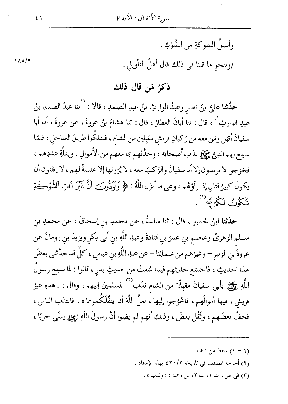 ذِكْرُ مَنْ قَالَ ذَلِكَ: حَدَّثَنَا عَلِيُّ بْنُ نَصْرٍ، وَعَبْدُ الْوَارِثِ بْنُ عَبْدِ الصَّمَدِ، قَالَا: ثنا عَبْدُ الصَّمَدِ بْنُ عَبْدِ الْوَارِثِ، قَالَ: ثنا أَبَانُ الْعَطَّارُ، قَالَ: ثنا هِشَامُ بْنُ عُرْوَةَ، عَنْ عُرْوَةَ: " أَنَّ §أَبَا سُفْيَانَ، أَقْبَلَ وَمَنْ مَعَهُ مِنْ رُكْبَانِ قُرَيْشٍ مُقْبِلِينَ مِنَ الشَّأْمِ، فَسَلَكُوا طَرِيقَ السَّاحِلِ فَلَمَّا سَمِعَ بِهِمُ النَّبِيُّ صَلَّى اللهُ عَلَيْهِ وَسَلَّمَ نَدَبَ أَصْحَابَهُ، وَحَدَّثَهُمْ بِمَا مَعَهُمْ مِنَ الْأَمْوَالِ وَبِقِلَّةِ عَدَدِهِمْ. فَخَرَجُوا لَا يُرِيدُونَ إِلَّا أَبَا سُفْيَانَ، وَالرَّكَبَ مَعَهُ لَا يَرَوْنَهَا إِلَّا غَنِيمَةً لَهُمْ، لَا يَظُنُّونَ أَنْ يَكُونَ كَبِيرُ قِتَالٍ إِذَا رَأَوْهُمْ. وَهِيَ مَا أَنْزَلَ اللَّهُ: {وَتَوَدُّونَ أَنَّ غَيْرَ ذَاتِ الشَّوْكَةِ تَكُونُ لَكُمْ} [الأنفال: 7] "
