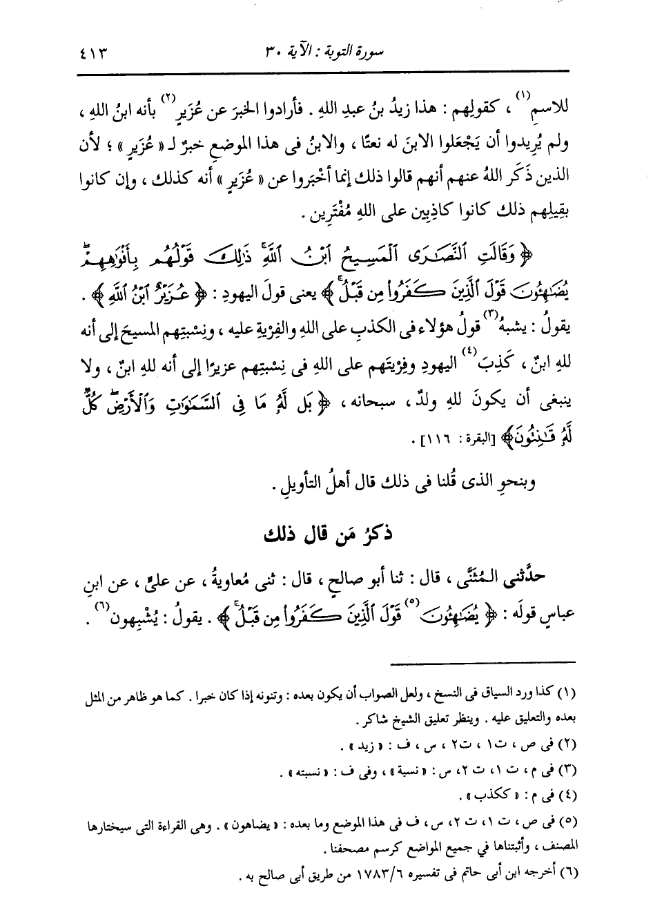 ذِكْرُ مَنْ قَالَ ذَلِكَ: حَدَّثَنِي الْمُثَنَّى، قَالَ: ثنا أَبُو صَالِحٍ، قَالَ: ثني مُعَاوِيَةُ، عَنْ عَلِيٍّ، عَنِ ابْنِ عَبَّاسٍ، قَوْلُهُ: " {§يُضَاهِئُونَ قَوْلَ الَّذِينَ كَفَرُوا مِنْ قَبْلُ} يَقُولُ: يُشْبِهُونَ "