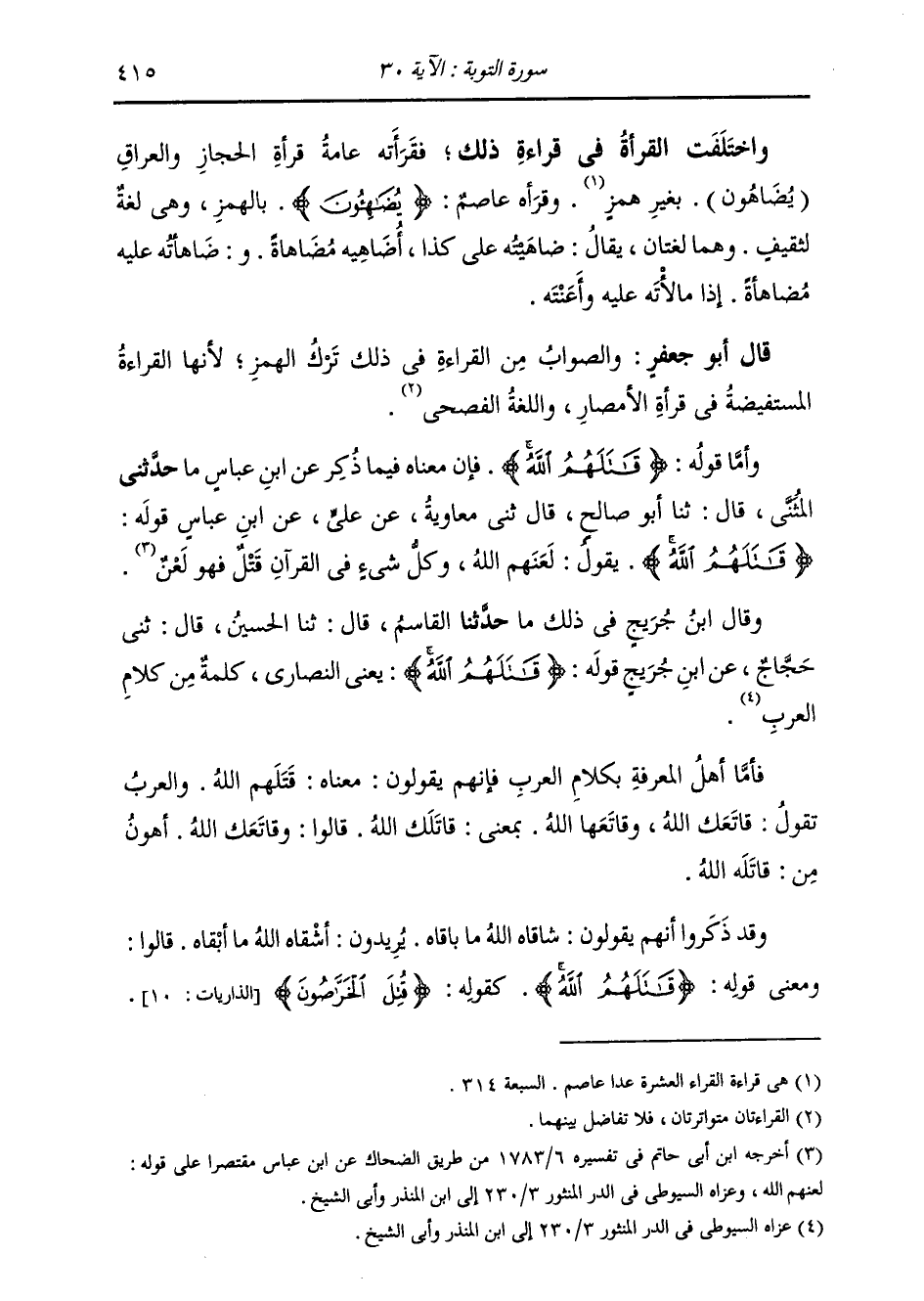 وَقَالَ ابْنُ جُرَيْجٍ فِي ذَلِكَ، مَا: حَدَّثَنَا الْقَاسِمُ، قَالَ: ثنا الْحُسَيْنُ، قَالَ: ثني حَجَّاجٌ، عَنِ ابْنِ جُرَيْجٍ، قَوْلُهُ: " {§قَاتَلَهُمُ اللَّهُ} [التوبة: 30] يَعْنِي النَّصَارَى، كَلِمَةٌ مِنْ كَلَامِ الْعَرَبِ " فَأَمَّا أَهْلُ الْمَعْرِفَةِ بِكَلَامِ الْعَرَبِ فَإِنَّهُمْ يَقُولُونَ مَعْنَاهُ: قَتَلَهُمُ اللَّهُ، وَالْعَرَبُ تَقُولُ: قَاتَعَكَ اللَّهُ، وَقَاتَعَهَا اللَّهُ، بِمَعْنَى: قَاتَلَكَ اللَّهُ، قَالُوا: وَقَاتَعَكَ اللَّهُ أَهْوَنُ مِنْ قَاتَلَهُ اللَّهُ. وَقَدْ ذَكَرُوا أَنَّهُمْ يَقُولُونَ: شَاقَاهُ اللَّهُ مَا بَاقَاهُ، يُرِيدُونَ: أَشْقَاهُ اللَّهُ مَا أَبْقَاهُ. قَالُوا: وَمَعْنَى قَوْلِهِ: {قَاتَلَهُمُ اللَّهُ} [التوبة: 30] كَقَوْلِهِ: {قُتِلَ الْخَرَّاصُونَ} [الذاريات: 10]