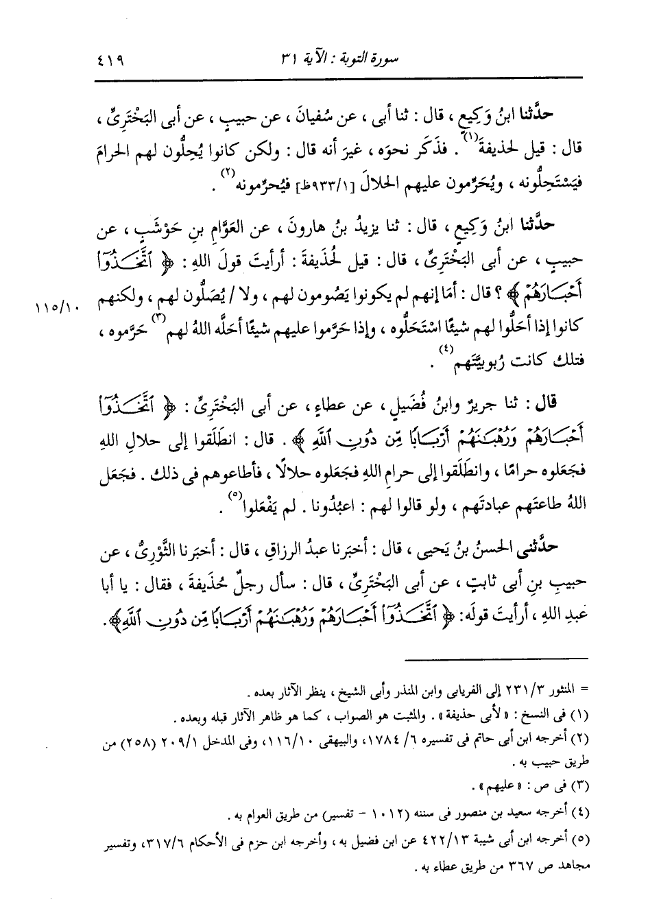حَدَّثَنَا ابْنُ وَكِيعٍ، قَالَ: ثنا يَزِيدُ بْنُ هَارُونَ، عَنِ الْعَوَّامِ بْنِ حَوْشَبٍ، عَنْ حَبِيبٍ، عَنْ أَبِي الْبَخْتَرِيِّ قَالَ: قِيلَ لِحُذَيْفَةَ: أَرَأَيْتَ قَوْلَ اللَّهِ: {§اتَّخَذُوا أَحْبَارَهُمْ} [التوبة: 31] قَالَ: «أَمَا إِنَّهُمْ لَمْ يَكُونُوا يَصُومُونَ لَهُمْ، وَلَا يُصَلُّونَ لَهُمْ، وَلَكِنَّهُمْ كَانُوا إِذَا أَحِلُّوا لَهُمْ شَيْئًا اسْتَحَلُّوهُ، وَإِذَا حَرَّمُوا عَلَيْهِمْ شَيْئًا أَحَلَّهُ اللَّهُ لَهُمْ حَرَّمُوهُ، فَتِلْكَ كَانَتْ رُبُوبِيَّتَهُمْ»