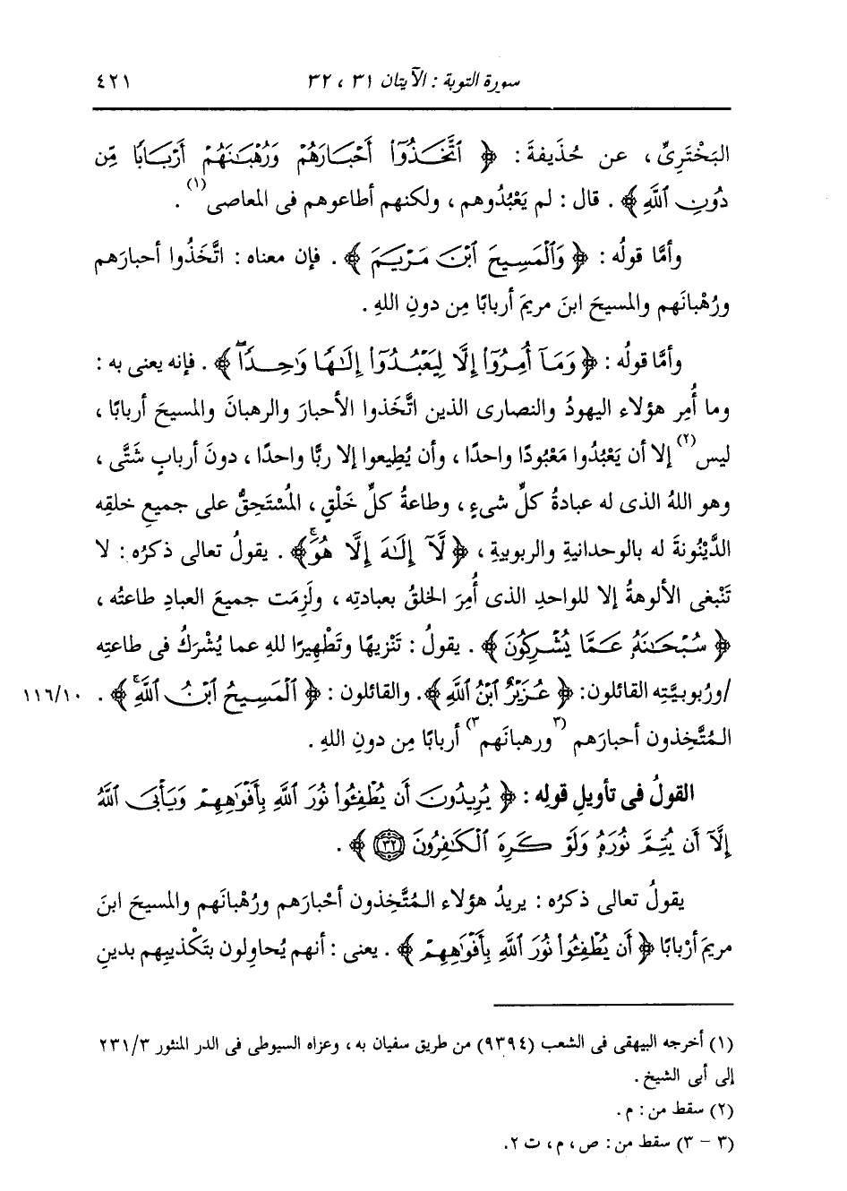 §وَأَمَّا قَوْلُهُ {وَالْمَسِيحَ ابْنَ مَرْيَمَ} [التوبة: 31] فَإِنَّ مَعْنَاهُ: اتَّخَذُوا أَحْبَارَهُمْ وَرُهْبَانَهُمْ وَالْمَسِيحَ ابْنَ مَرْيَمَ أَرْبَابًا مِنْ دُونِ اللَّهِ
